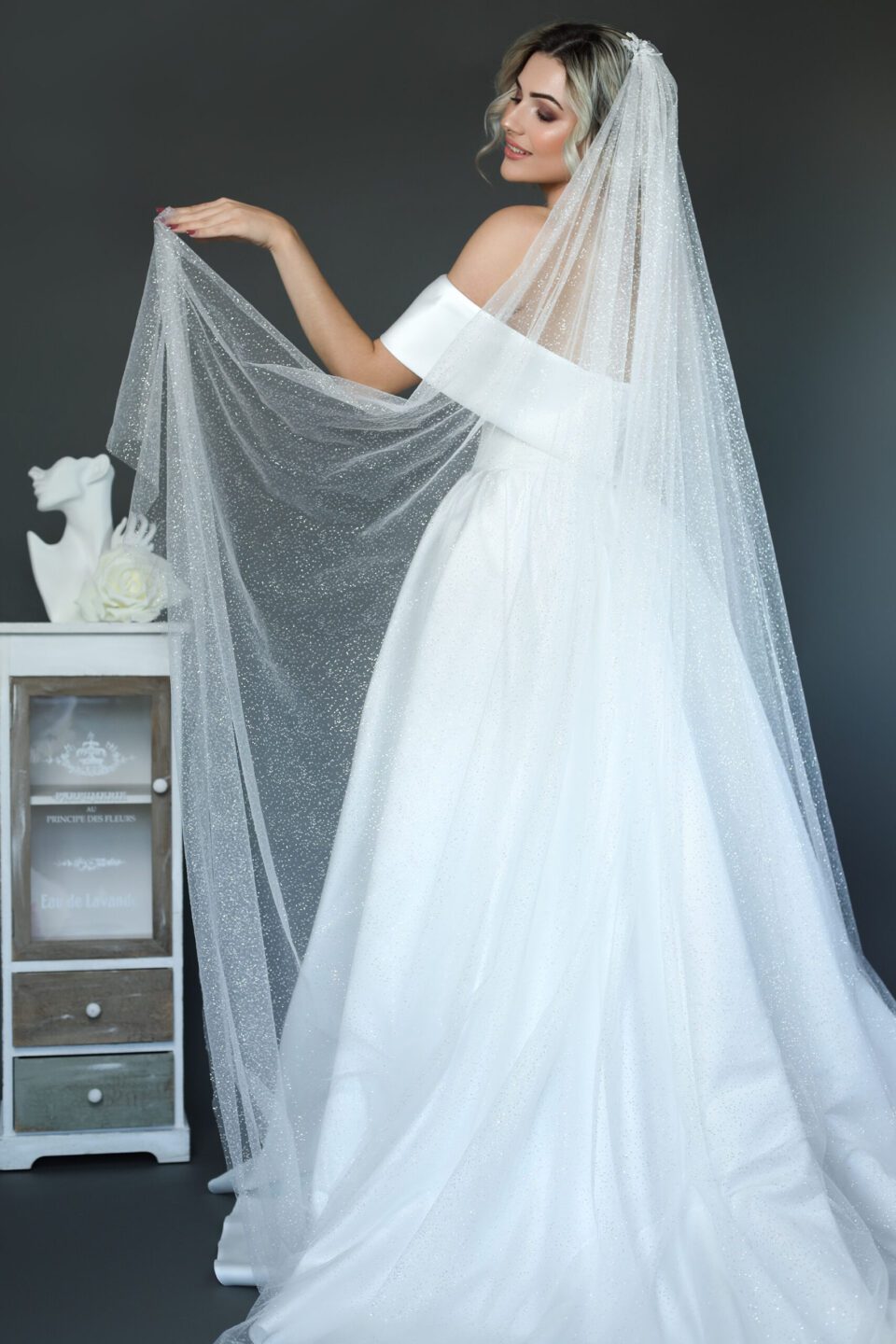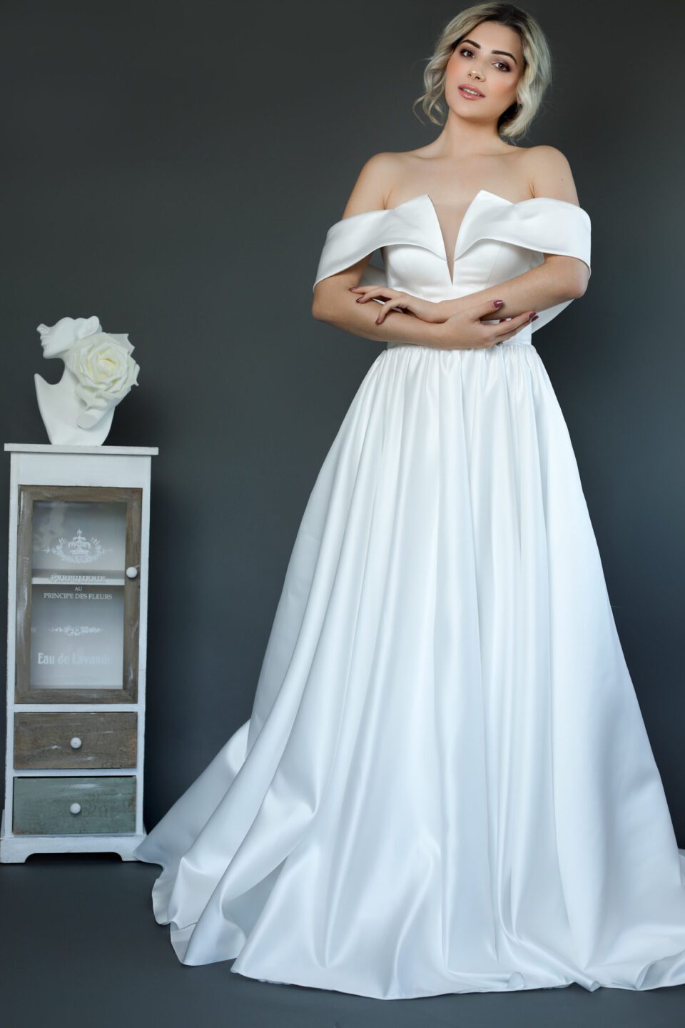 Εντυπωσιακό Πριγκιπικό νυφικό από μετάξι Mikado σε Άλφα γραμμή. Έξωμο με μπούστο V και διαφάνεια soleil. Κανονική εφαρμογή
