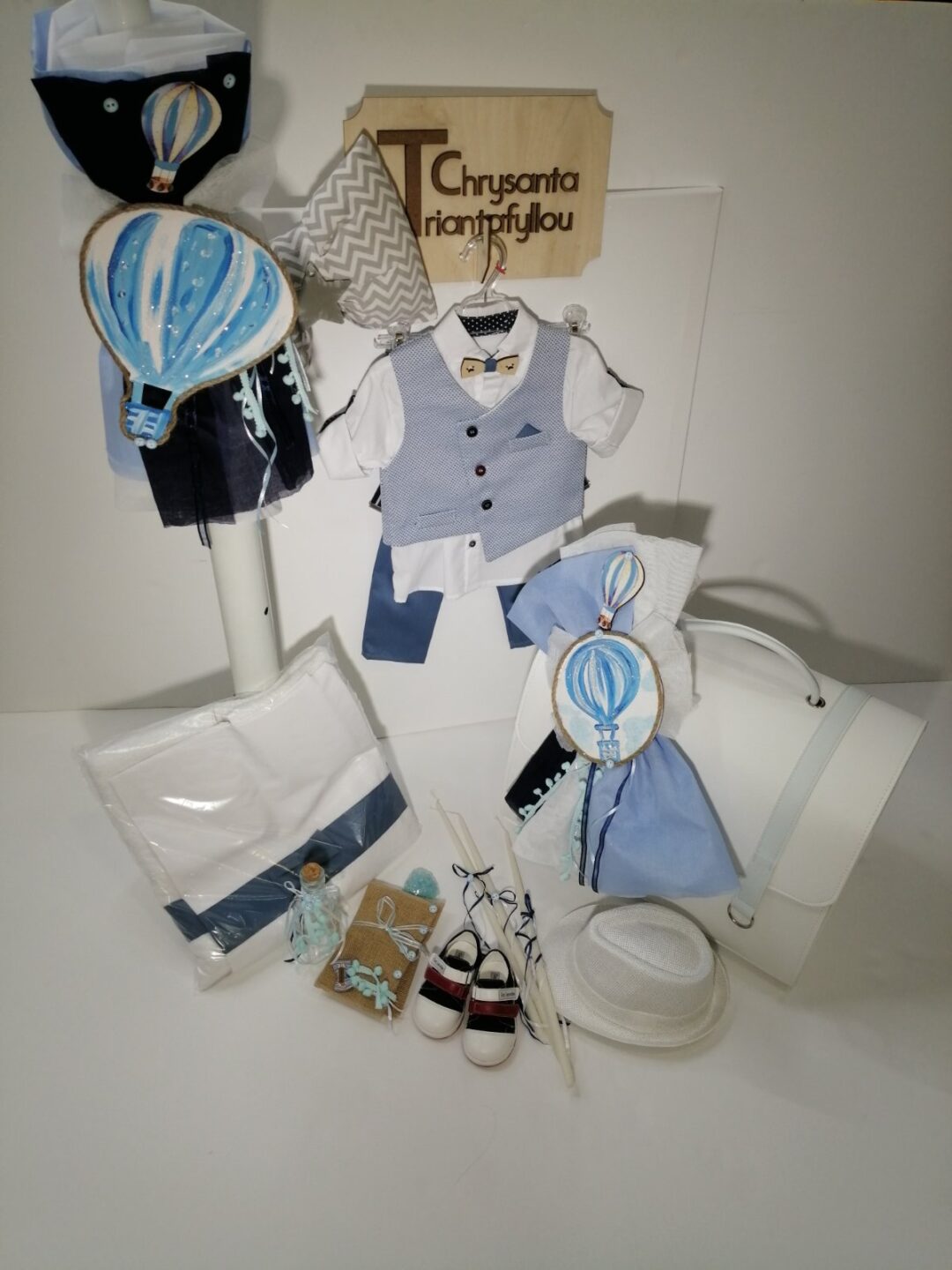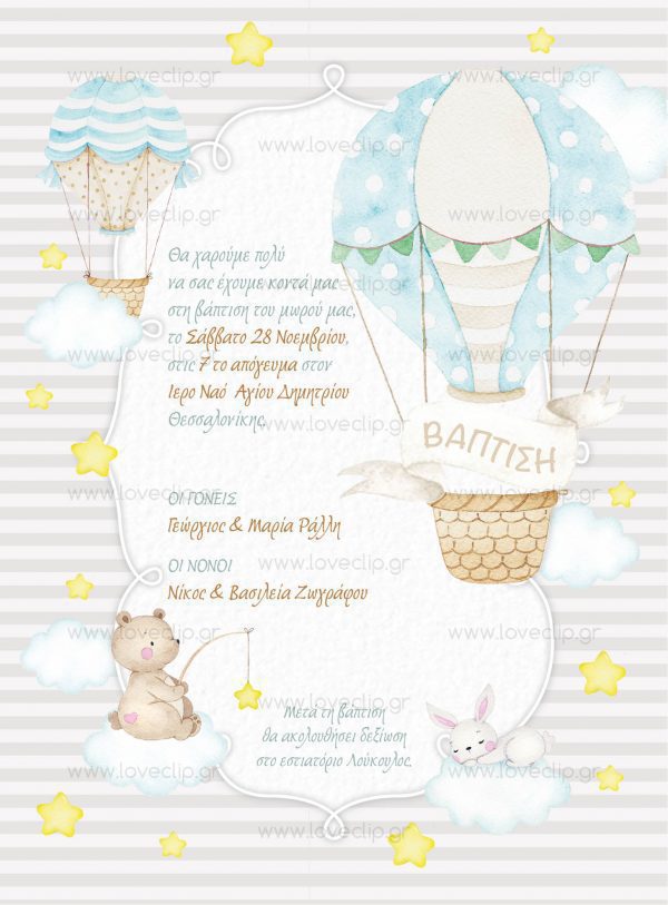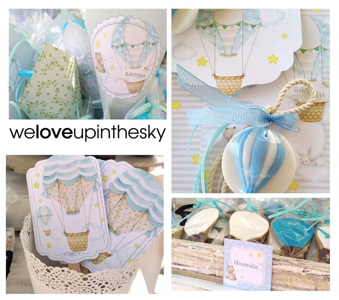 Επίλεξε για τη βάπτιση θέμα το Αερόστατο. Πρόσθεσε αυτή τη μακέτα στο καλάθι σου, διάλεξε το είδος προσκλητηρίου εδώ, την μπομπονιέρα εδώ και το πλήρες σετ βάπτισης εδώ, βάλτα όλα μαζί στο καλάθι αγορών σου μαζί με αυτό το θέμα και εμείς θα εφαρμόσουμε το θέμα σου παντού!