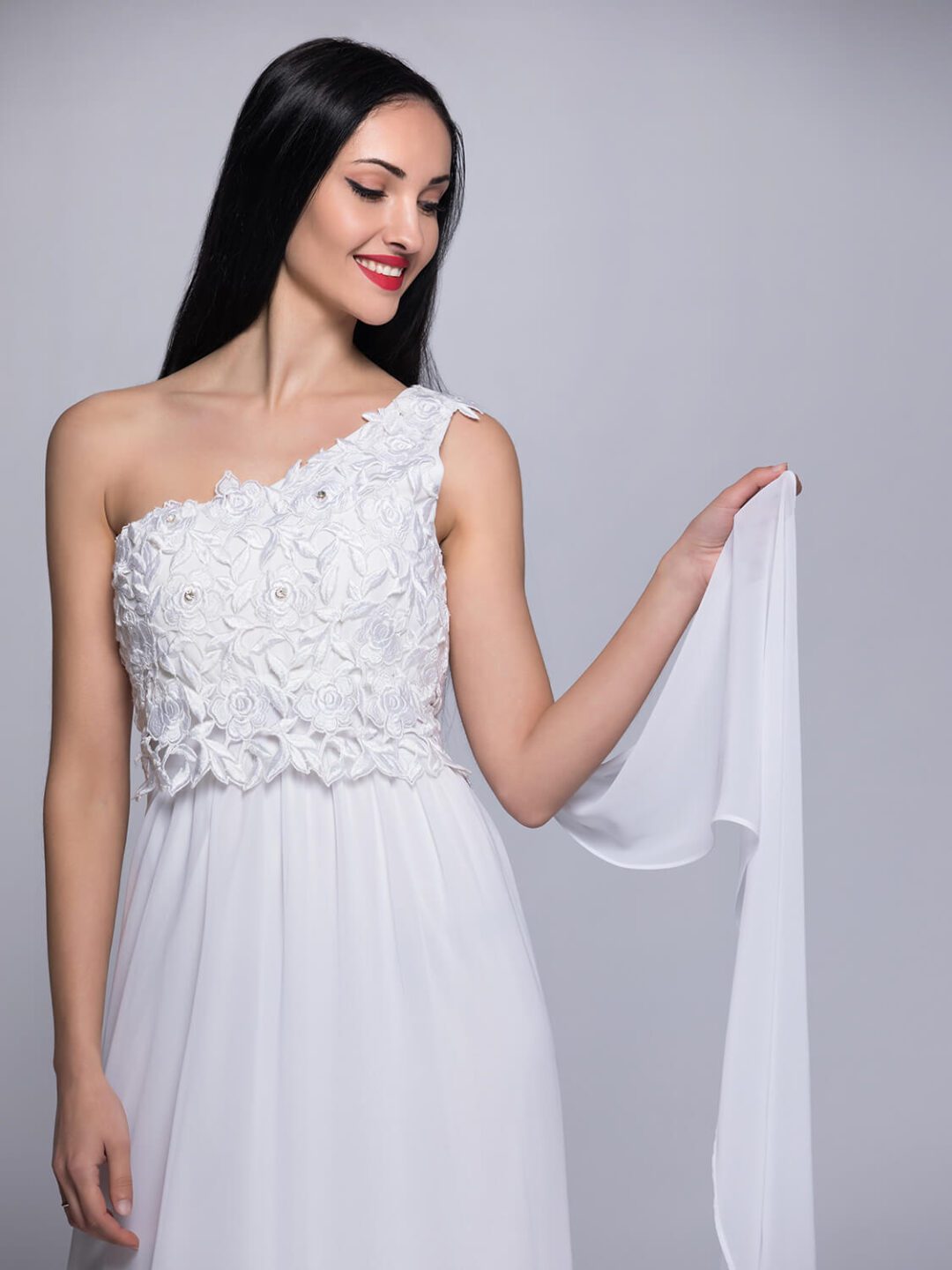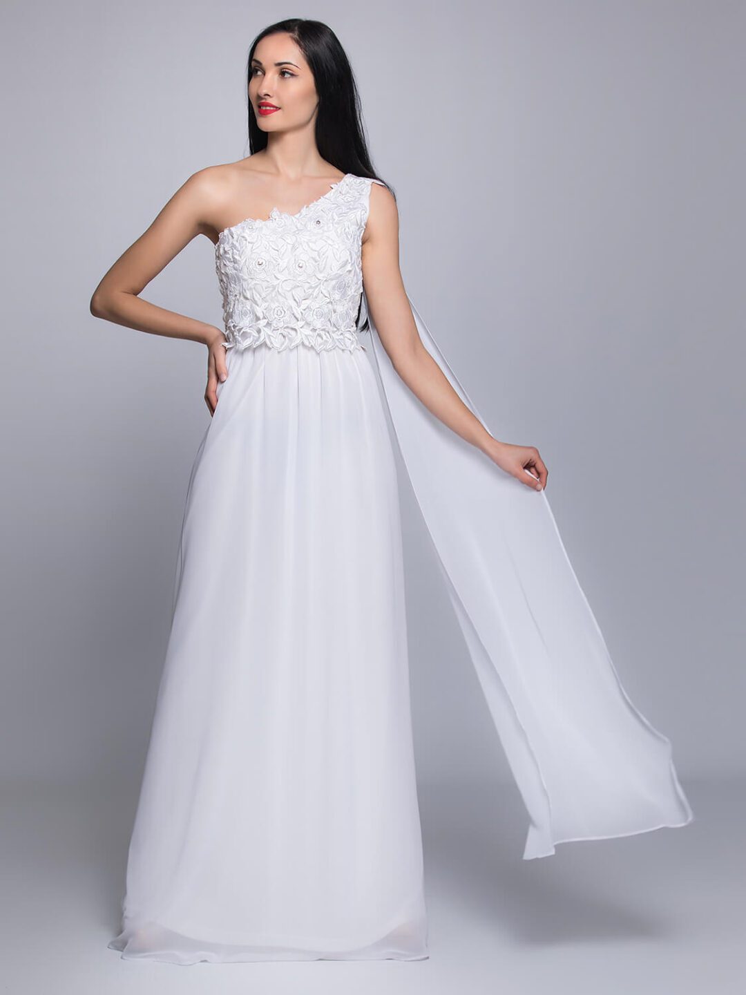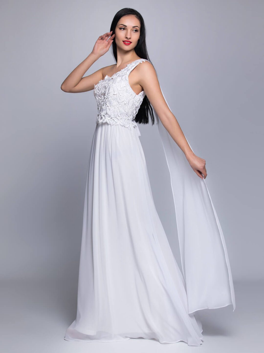 Αρχαιοελληνικό νυφικό από μεταξωτή μουσελίνα σε άλφα γραμμή, με κιπούρ δαντέλα, έναν ώμο και εντυπωσιακό τελείωμα από φύλλο μουσελίνας. Ένα υπέροχο αέρινο νυφικό φόρεμα ευρωπαϊκής προέλευσης ιδανικό και για πολιτικούς γάμους. Ενδεικνύεται και για εγκύους καθώς διαθέτει λάστιχο στην μέση. Πολλές νύφες μας μας έχουν εμπιστευτεί και έχουν αγοράσει με τις συμβουλές μας το νυφικό τους online. Αν δεν είσαι σίγουρη για την εφαρμογή του μπορείς να κλείσεις ραντεβού για πρόβα στο info@missvanity.gr για να επισκεφτείς το φυσικό μας κατάστημα. Για τα νυφικά που συμμετέχουν στο Bazaar, τα νούμερα είναι μοναδικά, εάν θέλετε γίνεται απευθείας προσαρμογή στις διαστάσεις σας με επιπλέον επιβάρυνση 50€ για την μεταποίηση.