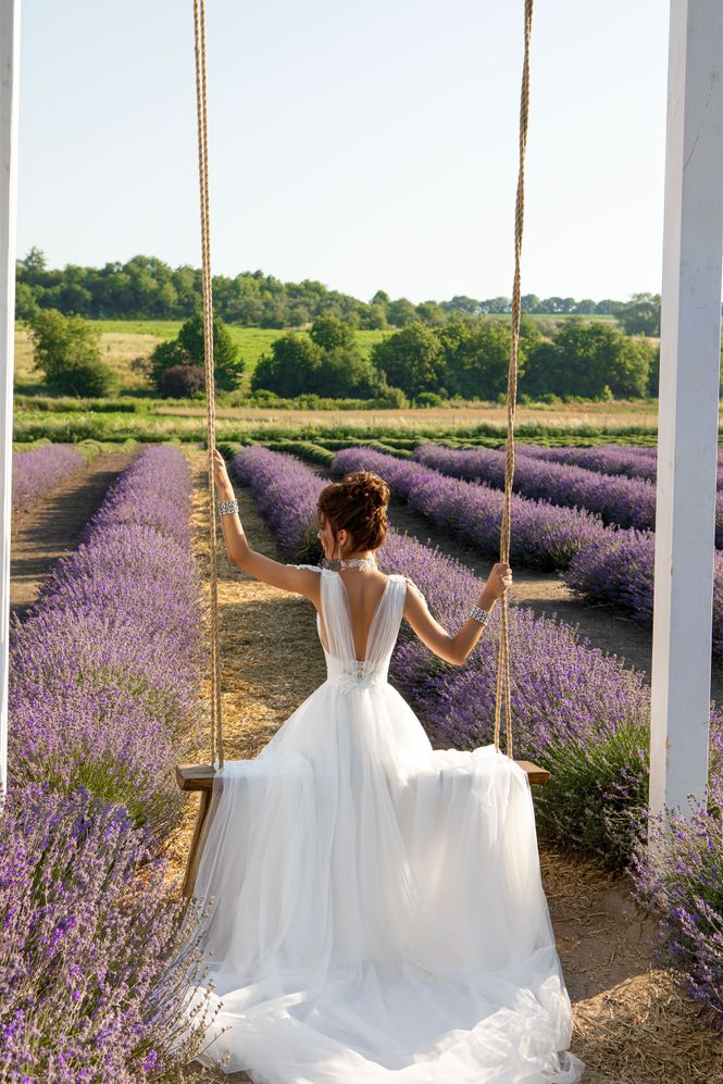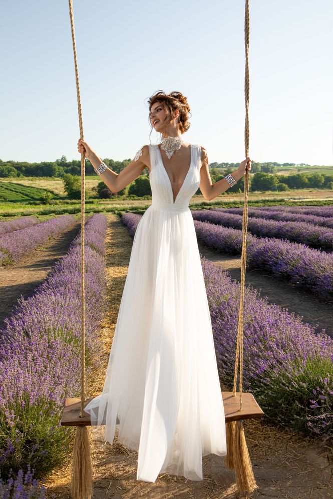 Αρχαιοελληνικό Nυφικό από γαλλικό τούλι, με ανοιχτή πλάτη και βαθύ V ντεκολτέ ενισχυμένο με διαφάνεια soleil. Χοντρή τιράντα από τούλι , διακοσμημένο με δαντέλα στους ώμους. Φούστα από γαλλικό τούλι σε Α γραμμή. Κανονική εφαρμογή