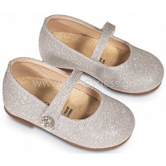 Βαπτιστικά παπούτσια γοβάκι με στρασένιο κουμπάκι από μεταλλιζέ ύφασμα με στρασένιο κουμπάκι.