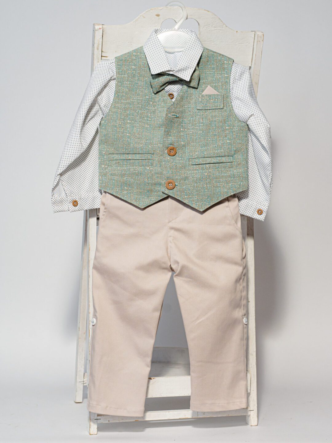 Βαπτιστικό κοστούμι με γιλέκο και παπιγιόν, σε εκρού με πράσινο μέντα. Σε περίπτωση έλλειψης αποθέματος απαιτούνται έως 15 εργάσιμες για την παραγωγή του