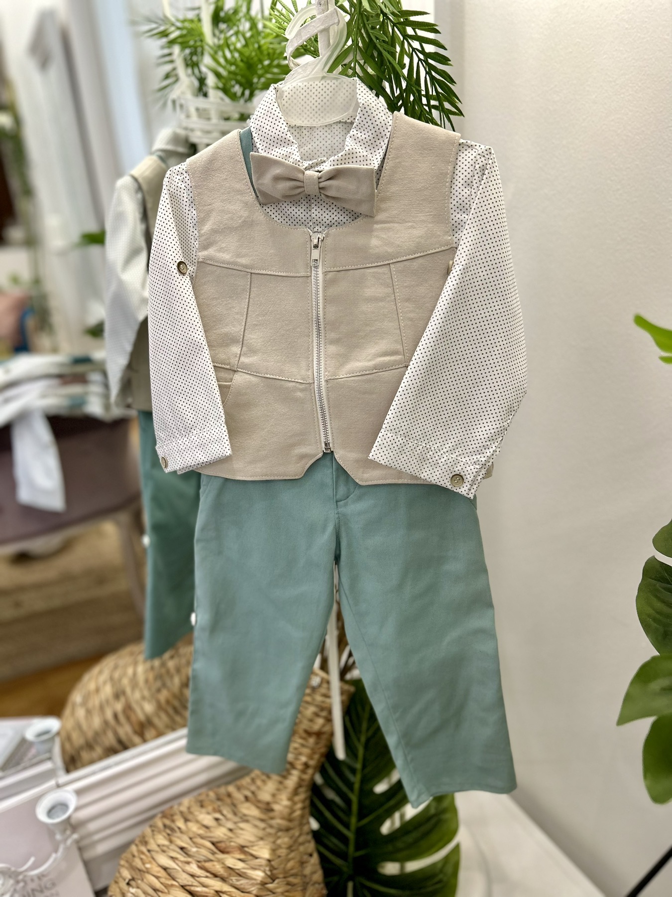 Βαπτιστικό κουστούμι με ιδιαίτερο γιλέκο. Διαθέτει μπεζ γιλέκο με φερμουάρ, λευκό πουκάμισο με σχέδιο, βεραμάν παντελόνι, παπιγιόν και δικό του καπελάκι και τιράντες.