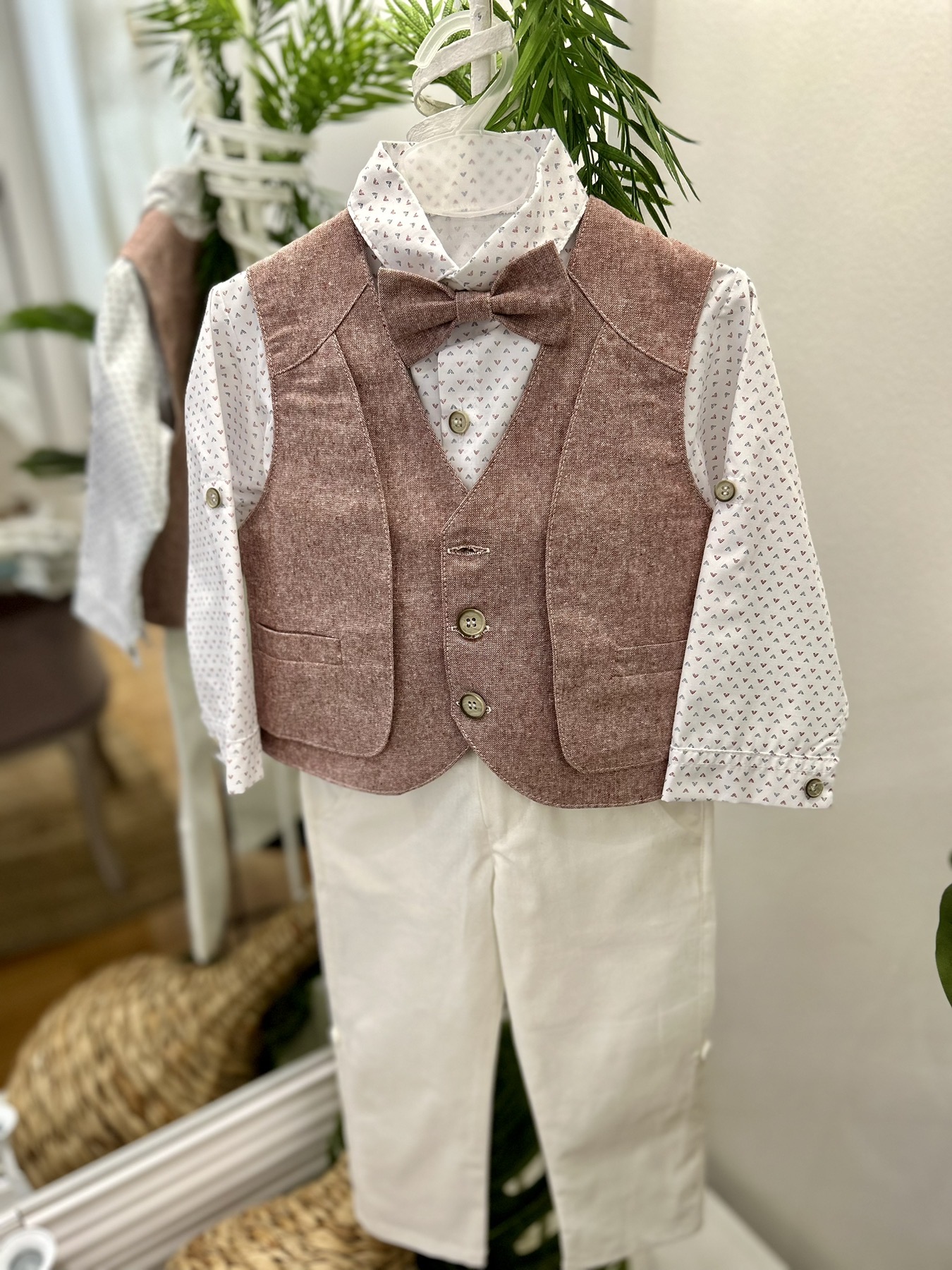 Βαπτιστικό κουστούμι σε ανοιχτόχρωμο σάπιο μήλο. Διαθέτει γιλέκο σε χρώμα σάπιο μήλο, λευκό πουκάμισο με σχέδιο, λευκό παντελόνι, παπιγιόν και δικό του καπελάκι και τιράντες.