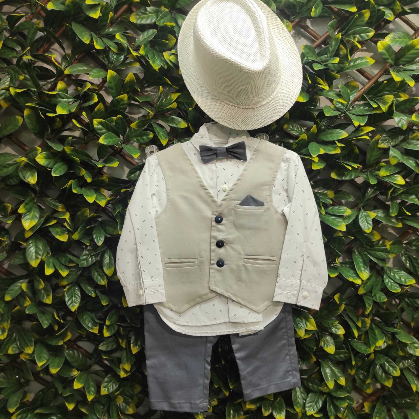 Βαπτιστικό κουστούμι σε γκρί αποχρώσεις. Διαθέτει γιλέκο, λευκό πουκάμισο με σχεδιάκια, γκρι παντελονάκι, παπιγιόν και καπελάκι.