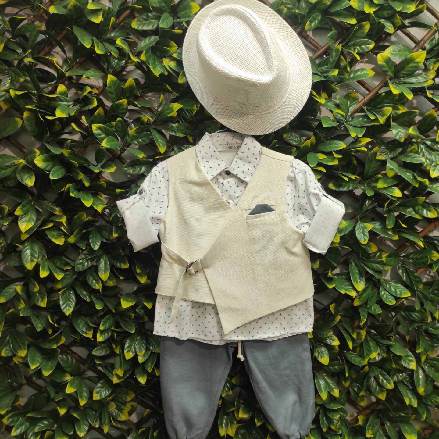 Βαπτιστικό κουστούμι σε γκρι και μπεζ αποχρώσεις. Διαθέτει γιλέκο, λευκό πουκάμισο με σχεδιάκια, γκρι παντελονάκι, παπιγιόν και καπελάκι.