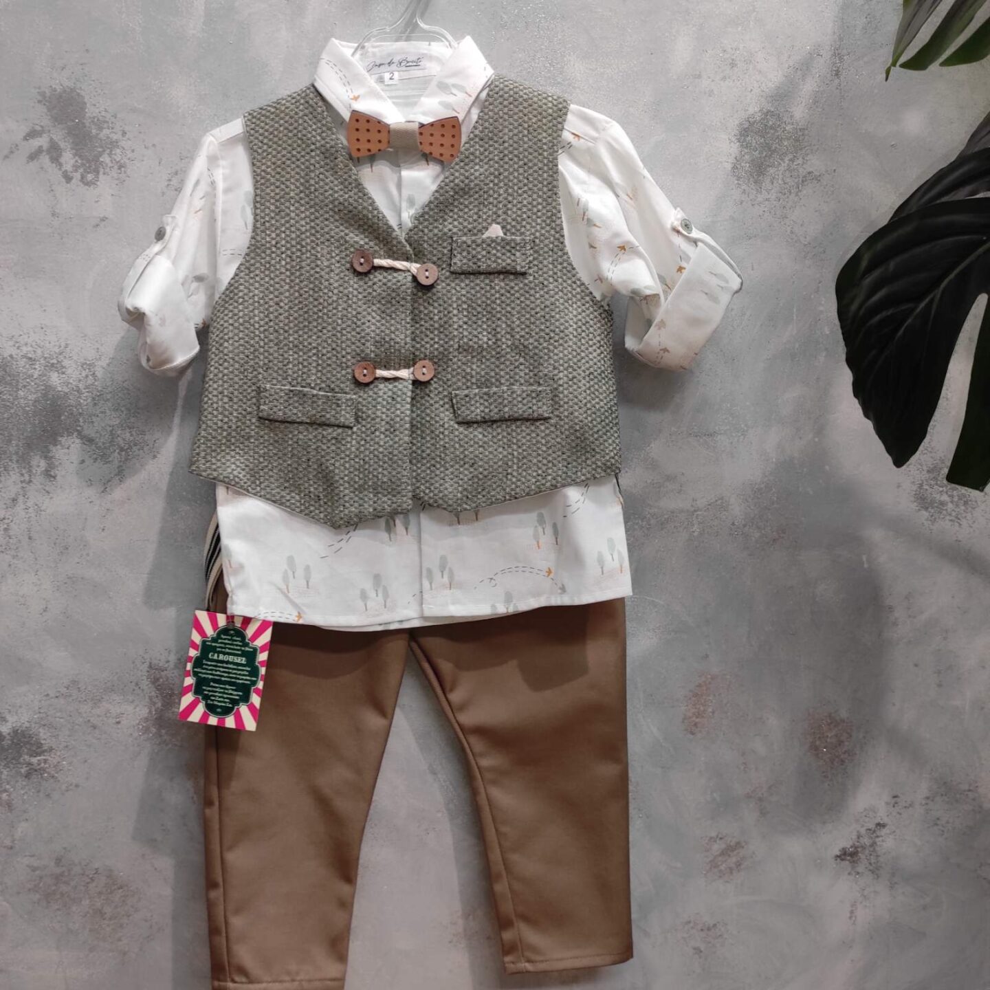 Βαπτιστικό κουστούμι σε καφέ με μπεζ αποχρώσεις. Διαθέτει γιλέκο, λευκό πουκάμισο με σχέδια, ζώνη και ξύλινο παπιγιόν. Σε περίπτωση έλλειψης αποθέματος απαιτούνται έως 15 εργάσιμες για την παραγωγή του. Διαθέσιμο και για ηλικίες 3-5 με 30€ επιβάρυνση. Γράψτε μας στα σχόλια της παραγγελίας σας το νούμερο-ηλικία του παιδιού και προσθέστε στο καλάθι σας και το επιπλέον κόστος από εδώ