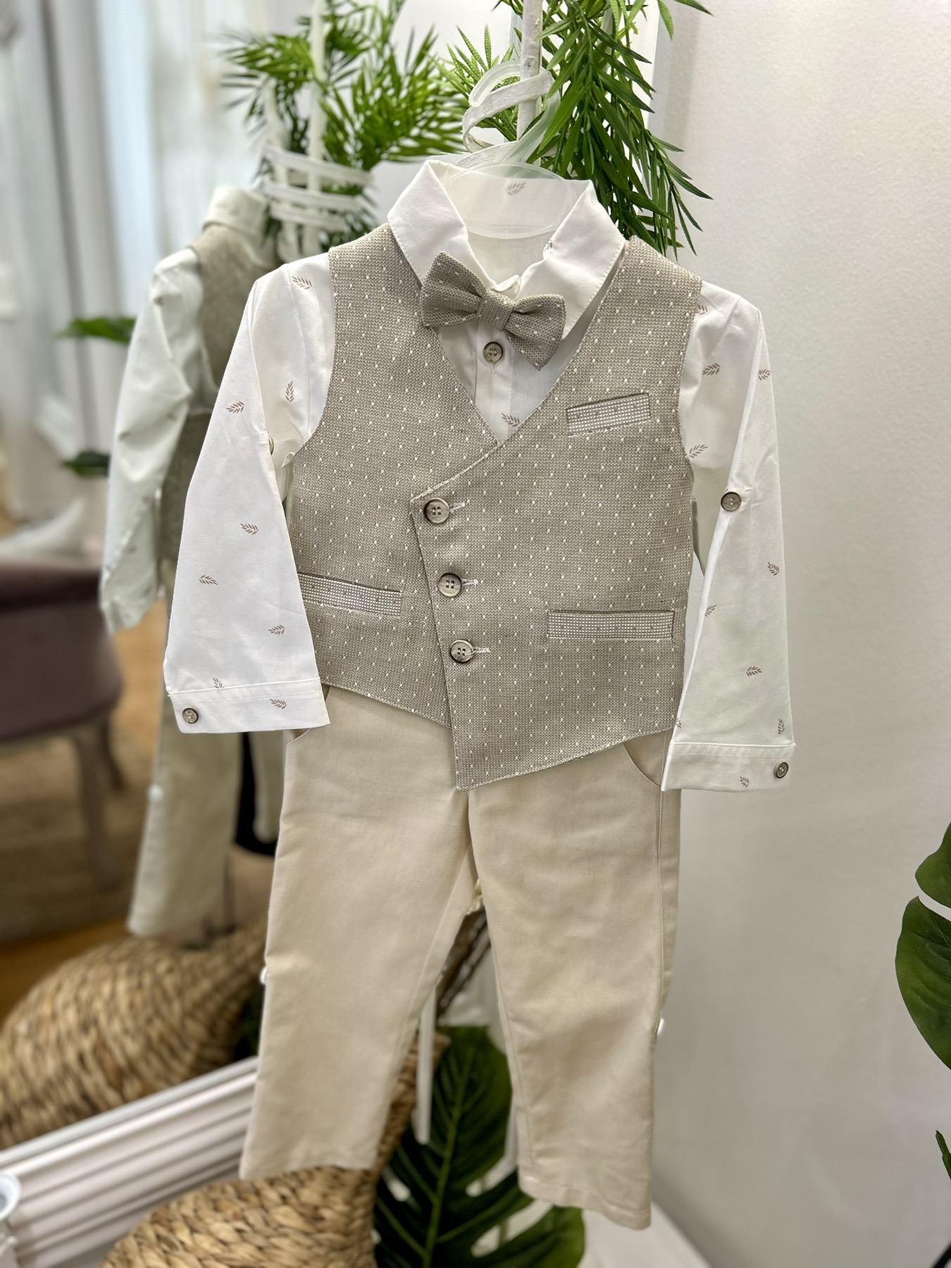 Βαπτιστικό κουστούμι σε μπεζ αποχρώσεις. Διαθέτει μπεζ γιλέκο, λευκό πουκάμισο με σχέδιο, μπεζ παντελόνι, παπιγιόν και δικό του καπελάκι και τιράντες.