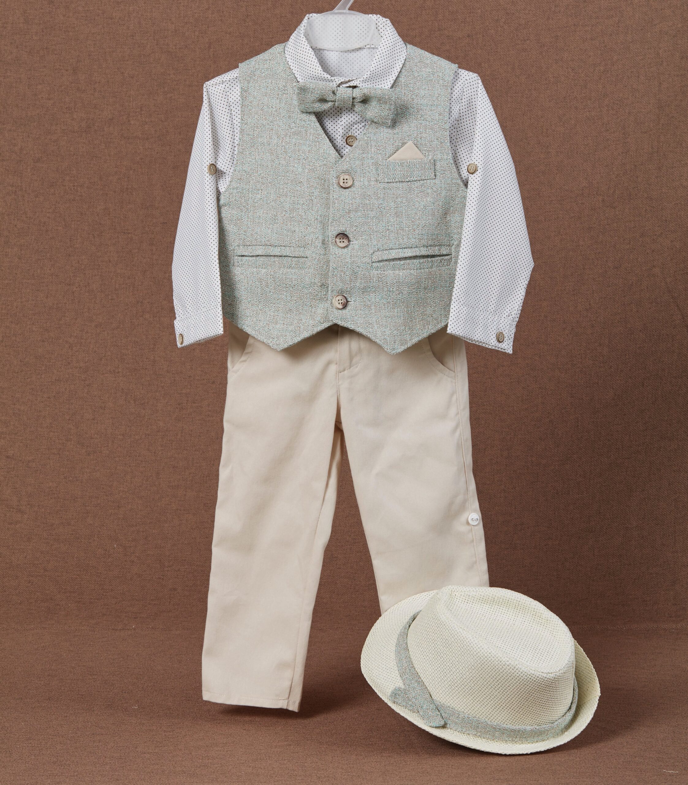 Βαπτιστικό κουστούμι σε μπεζ-γκρι αποχρώσεις. Διαθέτει γιλέκο σε απαλό γκρι χρώμα , λευκό πουκάμισο με σχέδιο, μπεζ παντελόνι, παπιγιόν και δικό του καπελάκι και τιράντες.