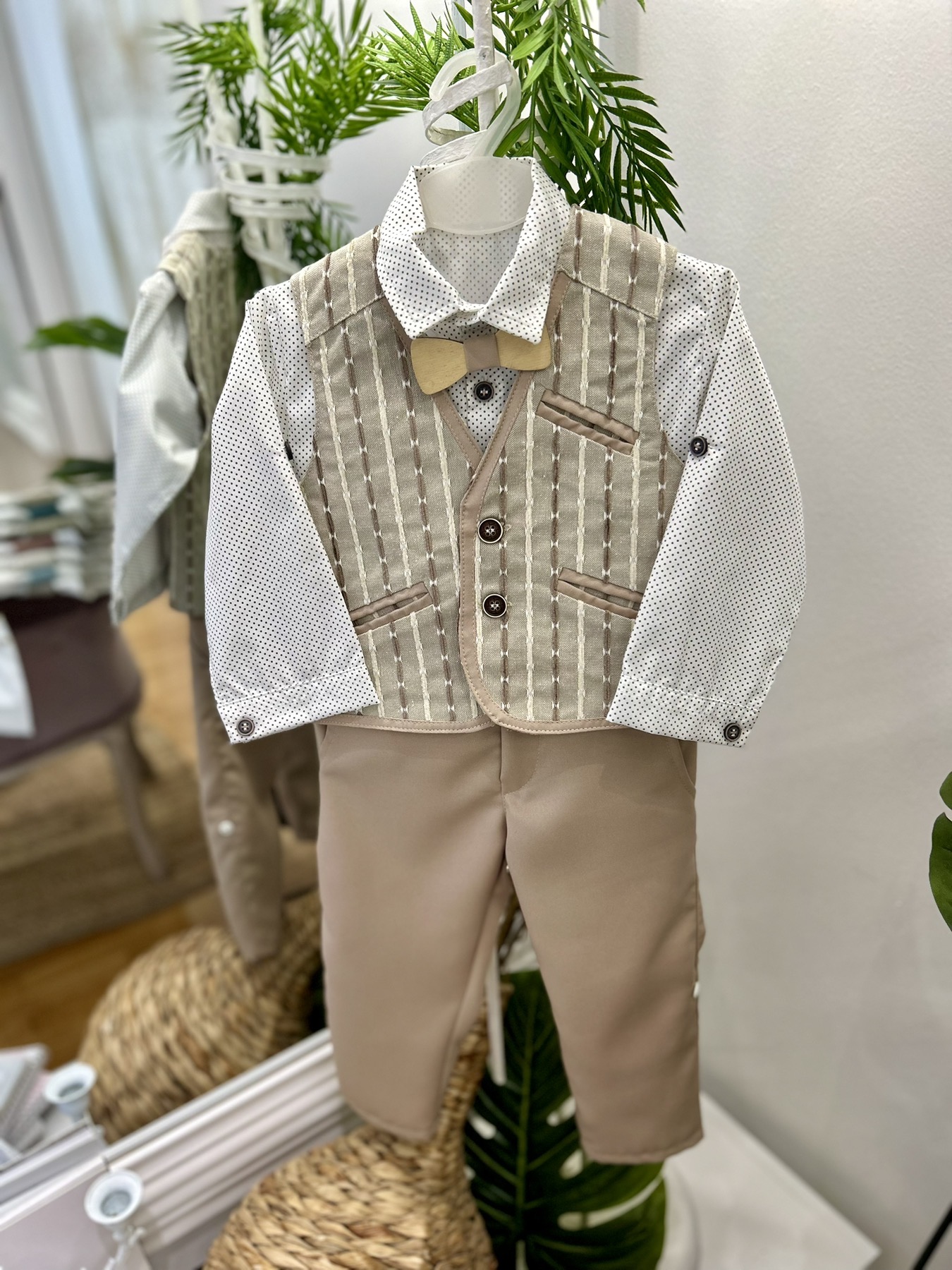 Βαπτιστικό κουστούμι σε μπεζ χρώματα.  Διαθέτει μπεζ  γιλέκο με σχέδιο, λευκό πουκάμισο με σχέδιο, μπεζ παντελόνι, παπιγιόν και δικό του καπελάκι και τιράντες.