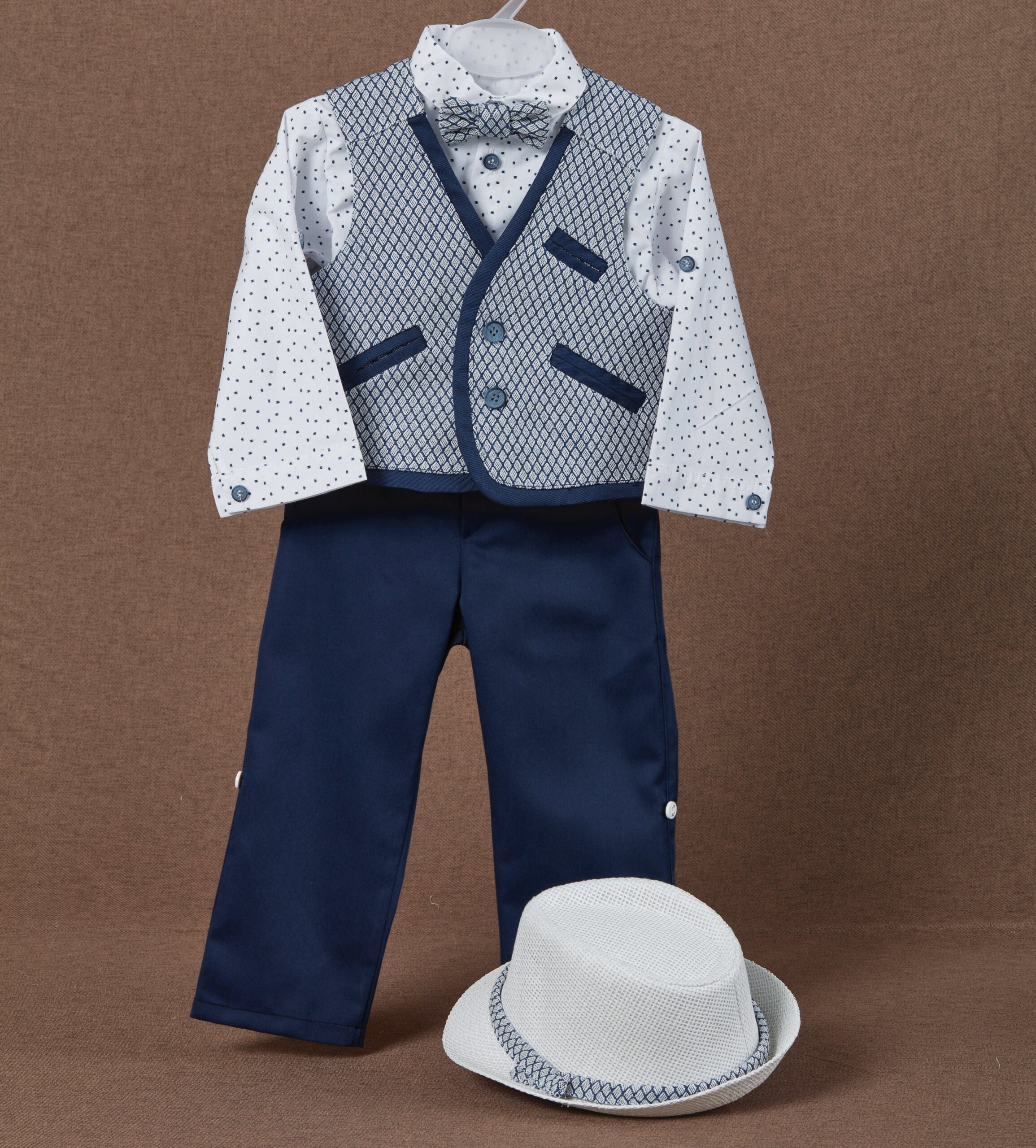 Βαπτιστικό κουστούμι σε μπλε αποχρώσεις. Διαθέτει μπλε γιλέκο, λευκό πουκάμισο με σχέδιο, μπλε παντελόνι, παπιγιόν και δικό του καπελάκι και τιράντες.