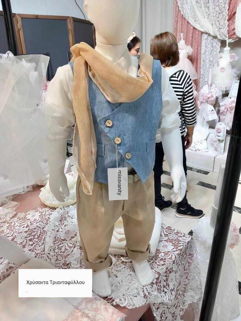 Βαπτιστικό κουστούμι σε τζιν αποχρώσεις. Διαθέτει γιλέκο, λευκό πουκάμισο, μπεζ παντελονάκι, παπιγιόν και καπελάκι.