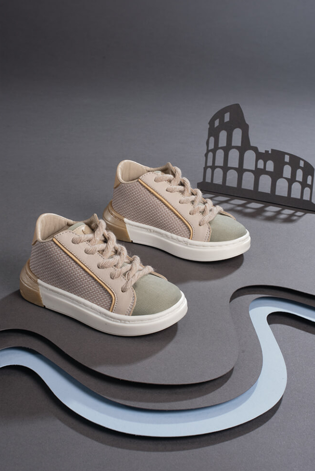 Βαπτιστικό παπούτσι για αγόρι Δετό Σνίκερ. Ανατομικό βαπτιστικό παπουτσάκι από ύφασμα και δέρμα σε μπεζ και μέντα χρώμα. Σειράς Exclusive από την BABYWALKER.