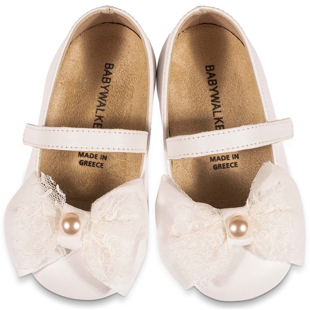 Βαπτιστικό παπούτσι μπαρέτα σε εκρού χρώμα. Διακοσμημένο με υφασμάτινο χειροποίητο φιόγκο και πέρλα. Με δερμάτινο ανατομικό πάτο για ξεκούραστο περπάτημα, κατάλληλο για τα πρώτα βήματα του παιδιού.Ελληνικής ραφής