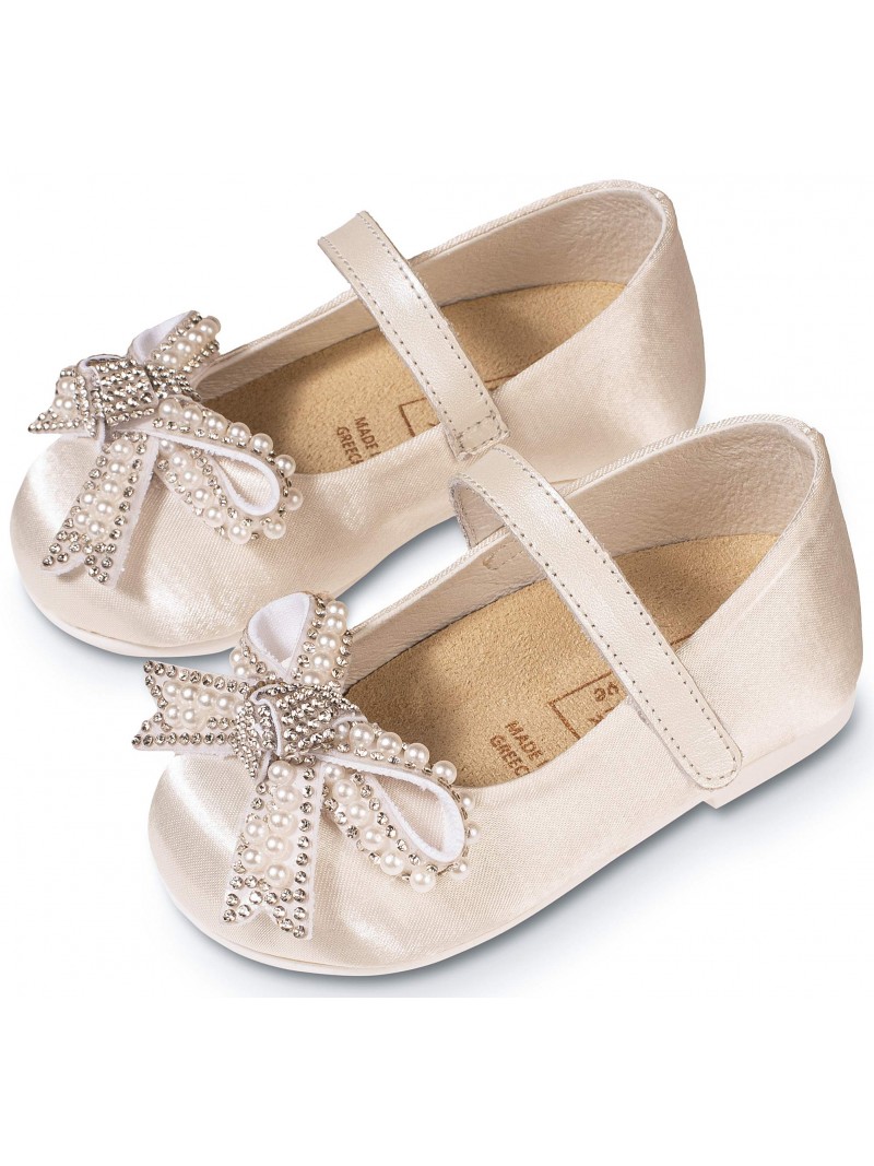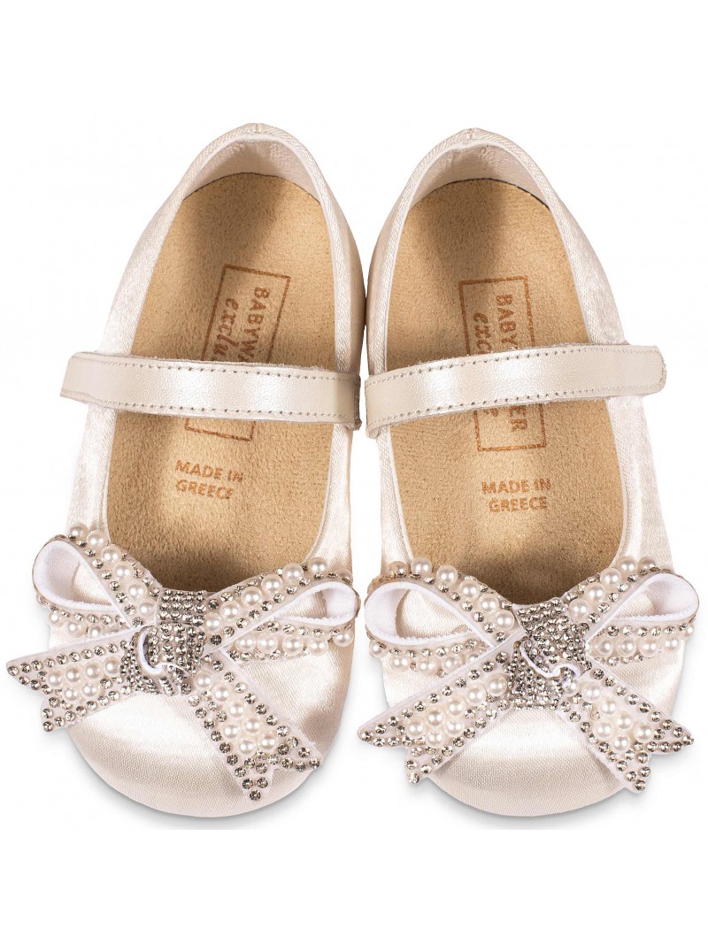 Βαπτιστικό παπούτσι μπαρέτα με φιογκάκι με πέρλες και στρας. Σε λευκό και ροζ χρώμα.