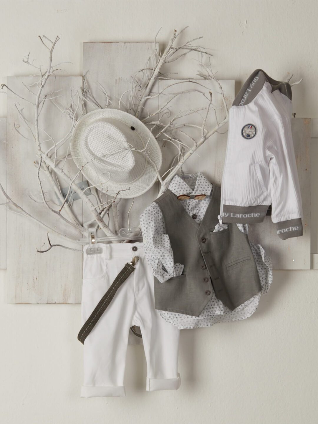 Βαπτιστικό ρούχο για αγόρι, σε άσπρο-γκρι, της Guy Laroche. Αποτελείται από άσπρο παντελόνι, πουά άσπρο πουκάμισο μακρυμάνικο, γκρι γιλέκο και άσπρο-γκρι μπουφανάκι. Συνοδεύεται από τιράντες και παπιγιόν στα ίδια χρώματα,  δώρο ψάθινο καπελάκι. Επωφελήσου από την προσφορά μας στα πλήρη σετ βάπτισης (δες τα εδώ) και συνδύασε το σετ βαπτιστικού κουτιού, τα ρούχα και το παπουτσάκι και απόκτησέ τα όλα στα 299€!