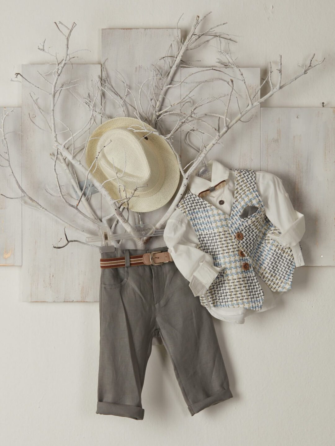 Βαπτιστικό ρούχο για αγόρι σε γκρι αποχρώσεις, της Guy Laroche. Αποτελείται από γκρι σκούρο παντελόνι, άσπρο πουκάμισο μακρυμάνικο και καρό γιλέκο με καφέ και μπλε ρίγες. Συνοδεύεται από ζώνη, μαντιλάκι και παπιγιόν στα ίδια χρώματα, δώρο ψάθινο καπελάκι. Επωφελήσου από την προσφορά μας στα πλήρη σετ βάπτισης (δες τα εδώ) και συνδύασε το σετ βαπτιστικού κουτιού, τα ρούχα και το παπουτσάκι και απόκτησέ τα όλα στα 299€! Το νούμερο 1 αντιστοιχεί στις ηλικίες 12-18 μηνών και το 2 σε 18-24 μηνών. Ελληνικής κατασκευής.