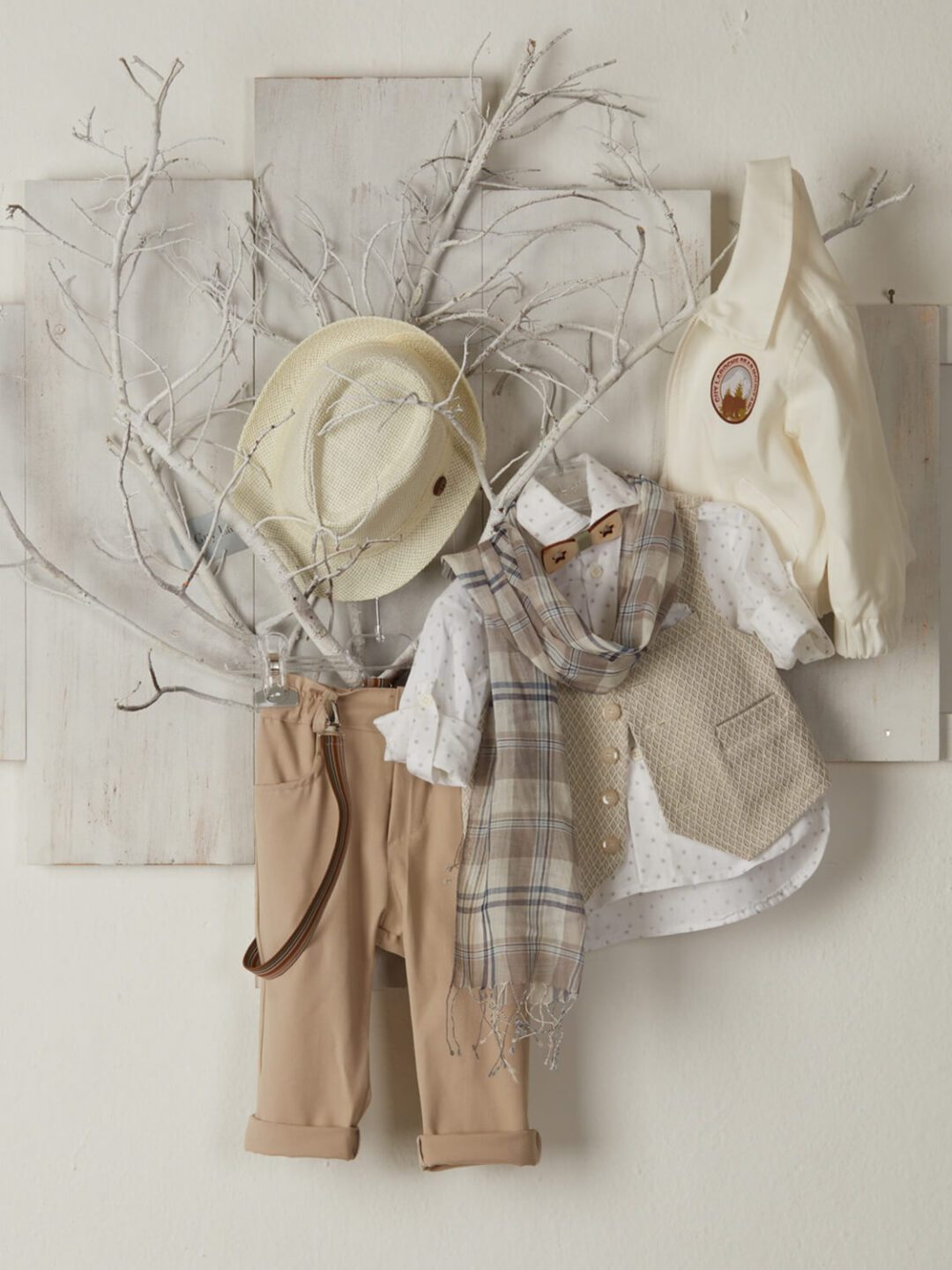 Βαπτιστικό ρούχο για αγόρι σε εκρού και μπεζ αποχρώσεις, της Guy Laroche. Αποτελείται από μπεζ παντελόνι, πουά άσπρο πουκάμισο μακρυμάνικο, μπεζ γιλέκο και εκρού μπουφανάκι. Συνοδεύεται από τιράντες, παπιγιόν και φουλάρι στα ίδια χρώματα, δώρο ψάθινο καπελάκι. Επωφελήσου από την προσφορά μας στα πλήρη σετ βάπτισης (δες τα εδώ) και συνδύασε το σετ βαπτιστικού κουτιού, τα ρούχα και το παπουτσάκι και απόκτησέ τα όλα στα 299€! Το νούμερο 1 αντιστοιχεί στις ηλικίες 12-18 μηνών και το 2 σε 18-24 μηνών. Ελληνικής κατασκευής.