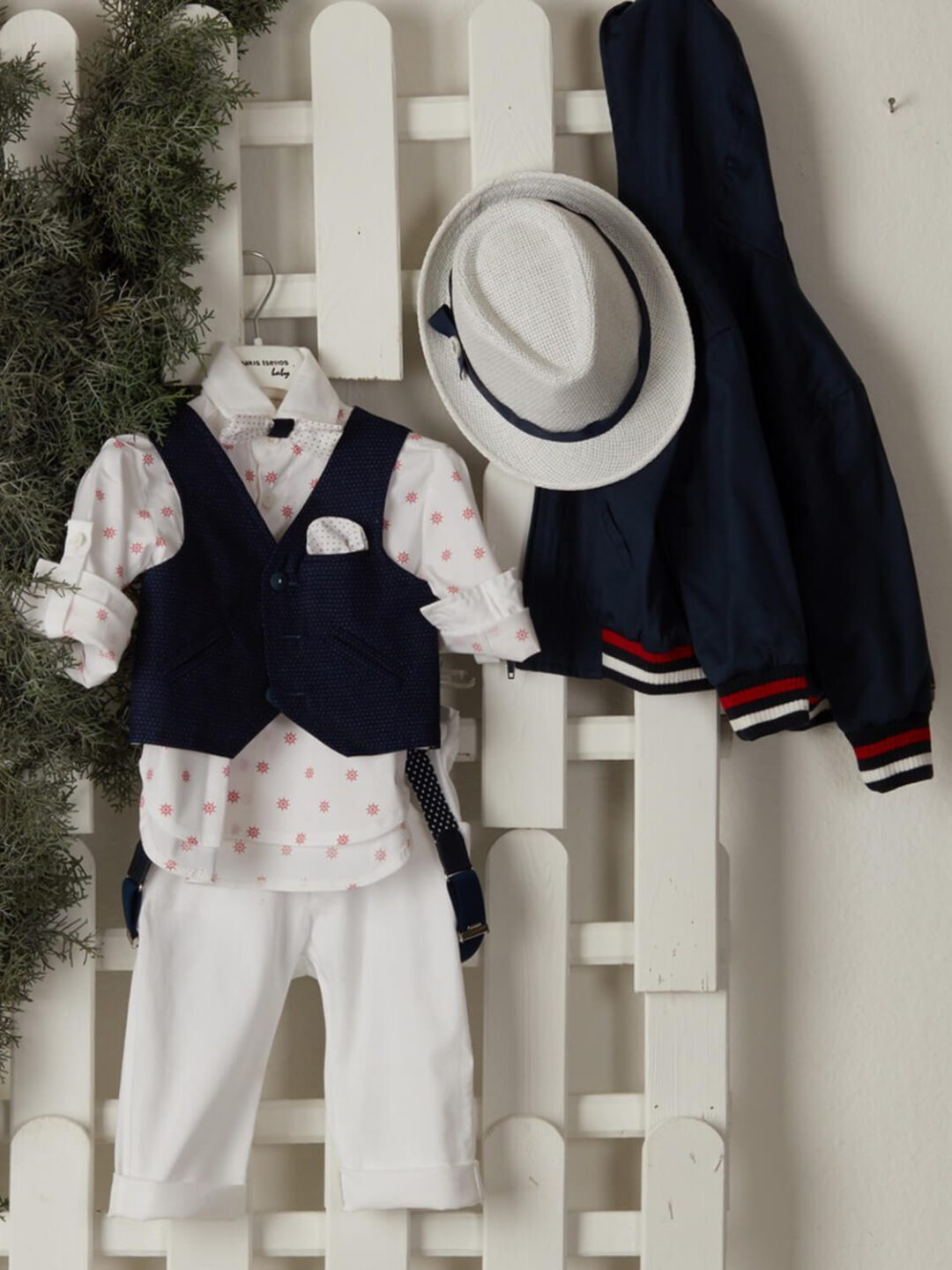 Βαπτιστικό ρούχο για αγόρι σε χρώματα σκούρο μπλε με άσπρο. Αποτελείται από άσπρο παντελόνι από βαμβακερή καμπαρτίνα, πουά λευκό μακρυμάνικο πουκάμισο, μπλε γιλέκο, συνοδεύεται από αξεσουάρ στα ίδια χρώματα, τιράντες, φουλάρι, παπιγιόν και μαντιλάκι, δώρο ψάθινο καπελάκι. Επωφελήσου από την προσφορά μας στα πλήρη σετ βάπτισης (δες τα εδώ) και συνδύασε το σετ βαπτιστικού κουτιού, τα ρούχα και το παπουτσάκι και απόκτησέ τα όλα στα 299€! Το νούμερο 1 αντιστοιχεί στις ηλικίες 12-18 μηνών και το 2 σε 18-24 μηνών. Ελληνικής κατασκευής.