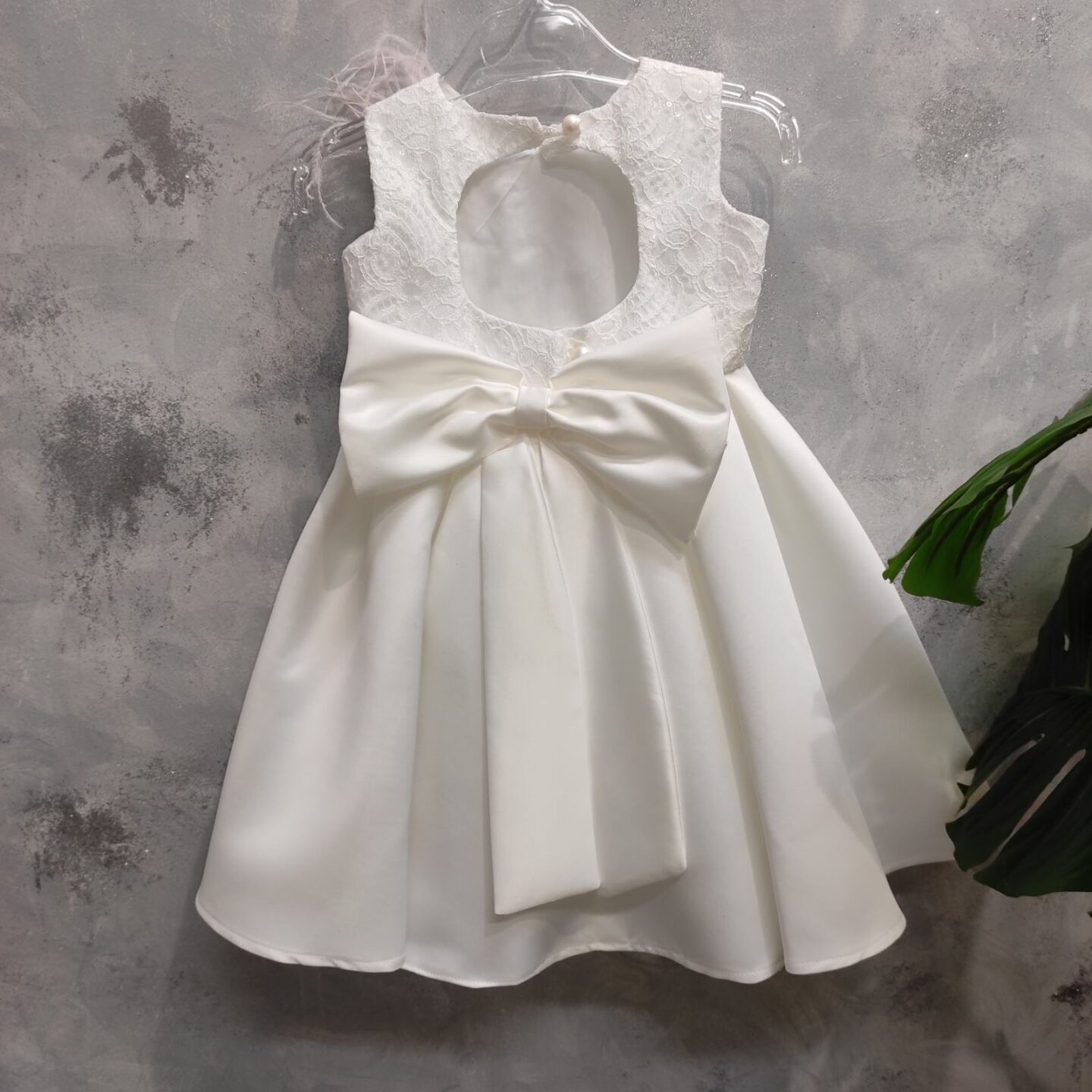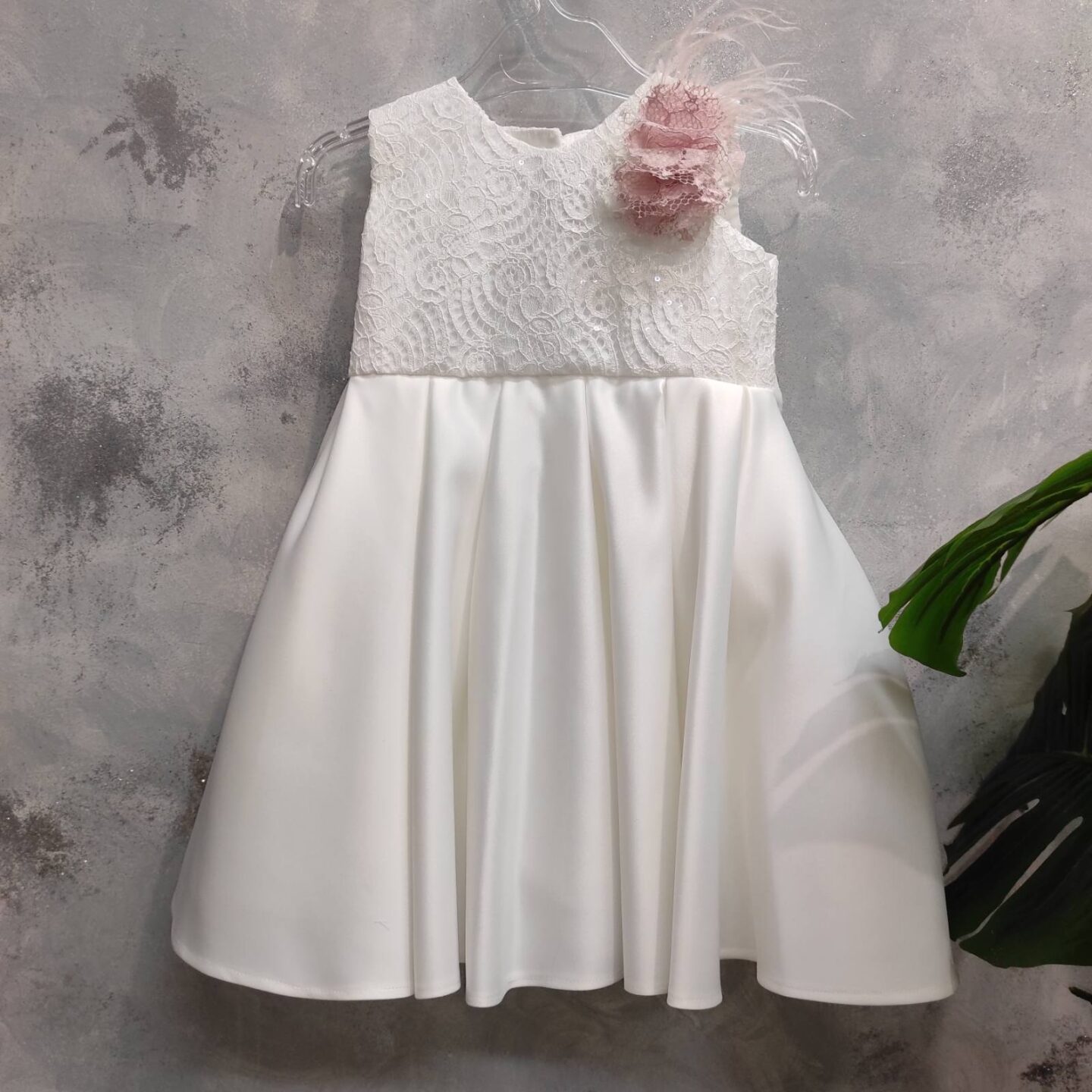 Βαπτιστικό φόρεμα σατέν με δαντέλα στο πάνω μέρος. Διαθέτει όμορφη λεπτομέρεια με λουλουδάκι σε σάπιο μήλο και φτερά. Καλύπτει εως 24 μηνών.