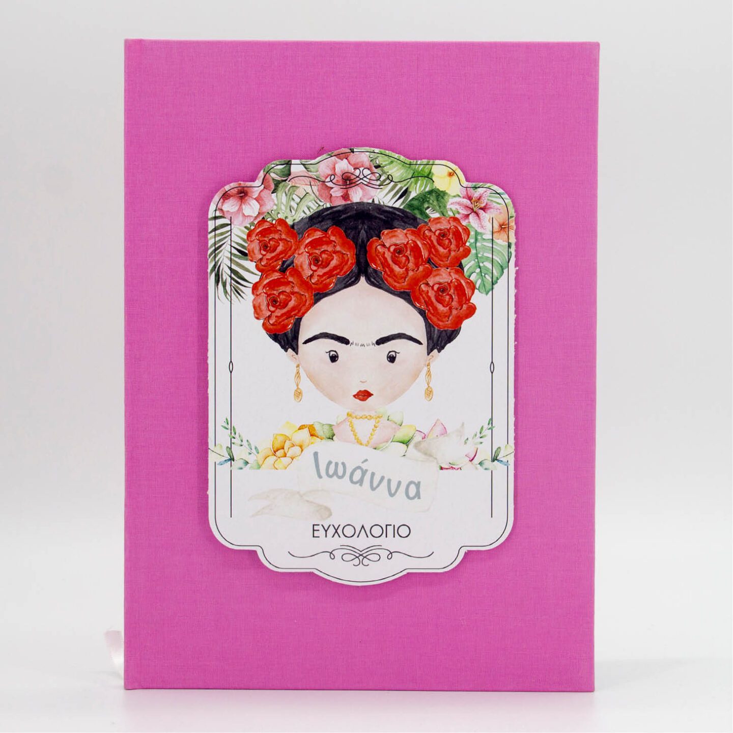 Βιβλίο ευχών µε υφασμάτινη βιβλιοδεσία, διάστασης Α4 με 4χρωµη ετικέτα από χαρτόνι 3χλ στο θέμα του μυστηρίου. Διατίθεται σε 4 χρώματα ροζ, σιέλ, μέντα και μόκα.