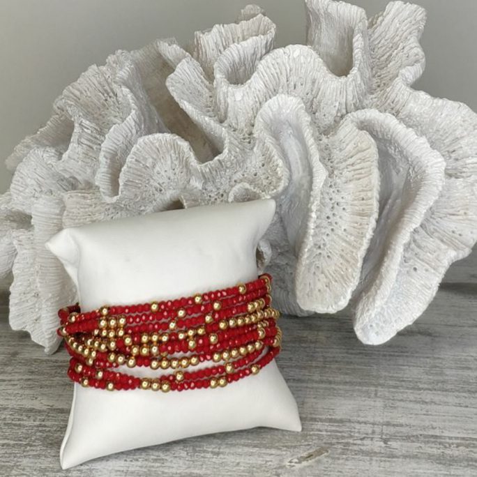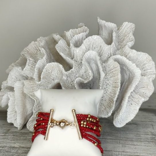 Βραχιόλι με πολλές σειρές και χάντρες επίχρυσες και jade ρουμπινί . Μήκος 18εκ. Οι χειροποίητες δημιουργίες του Tresento είναι επιχρυσωμένες με 24 καράτια ή επιροδιωμένες, ενδέχεται να χρειαστούν έως 15 εργάσιμες ημέρες για την κατασκευή τους. Ελληνικής κατασκευής.