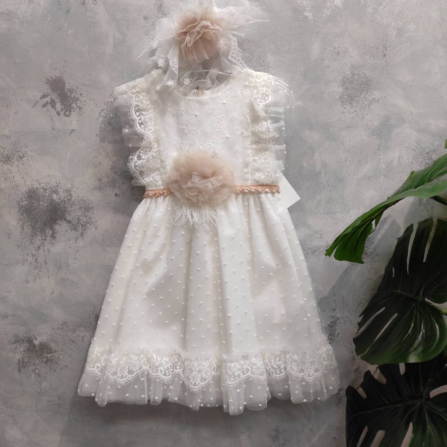 Βoho βαπτιστικό φόρεμα πουά με τούλι και λεπτομέρειες με λουλούδι σε μπεζ χρώμα. Καλύπτει εως 24 μηνών.
