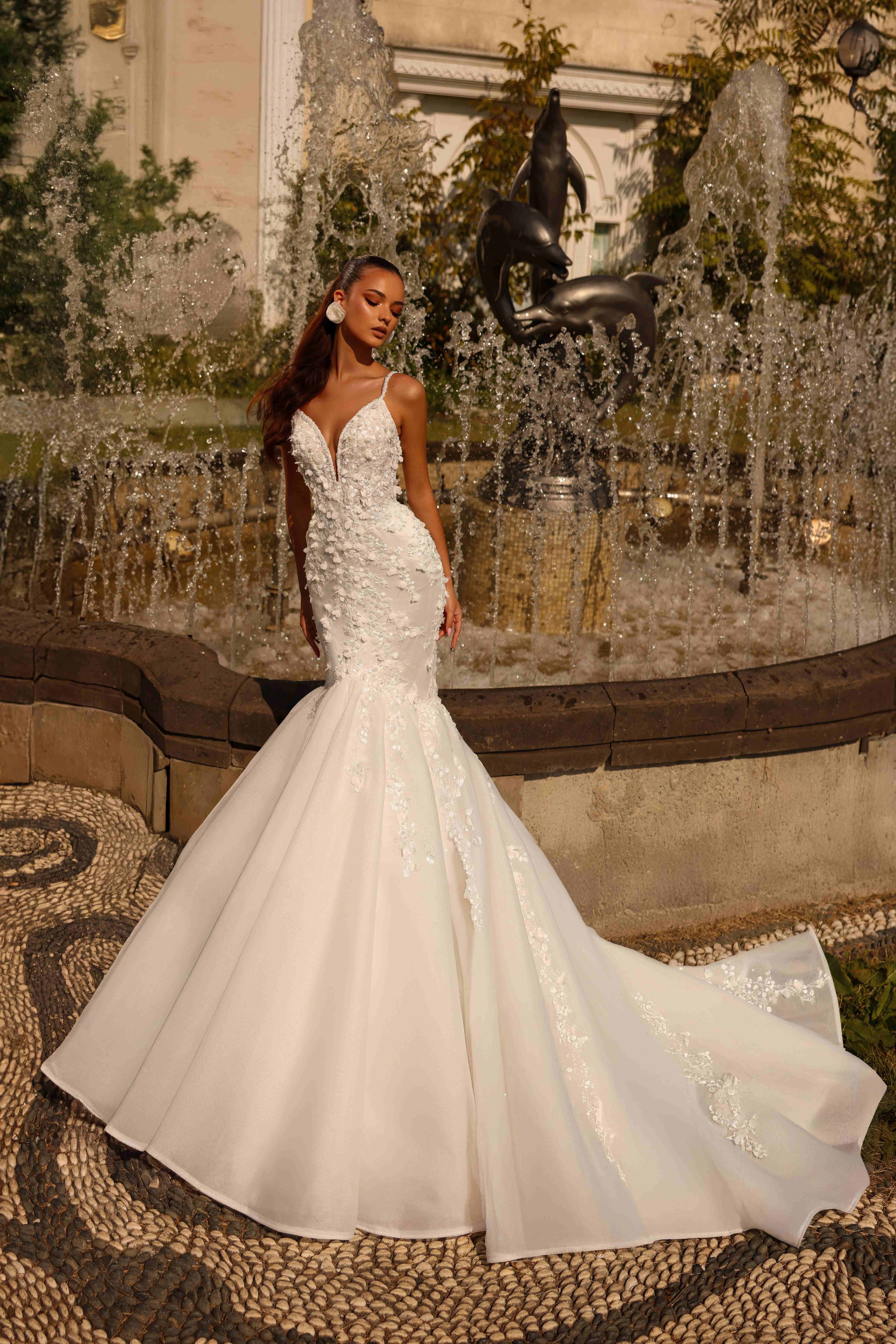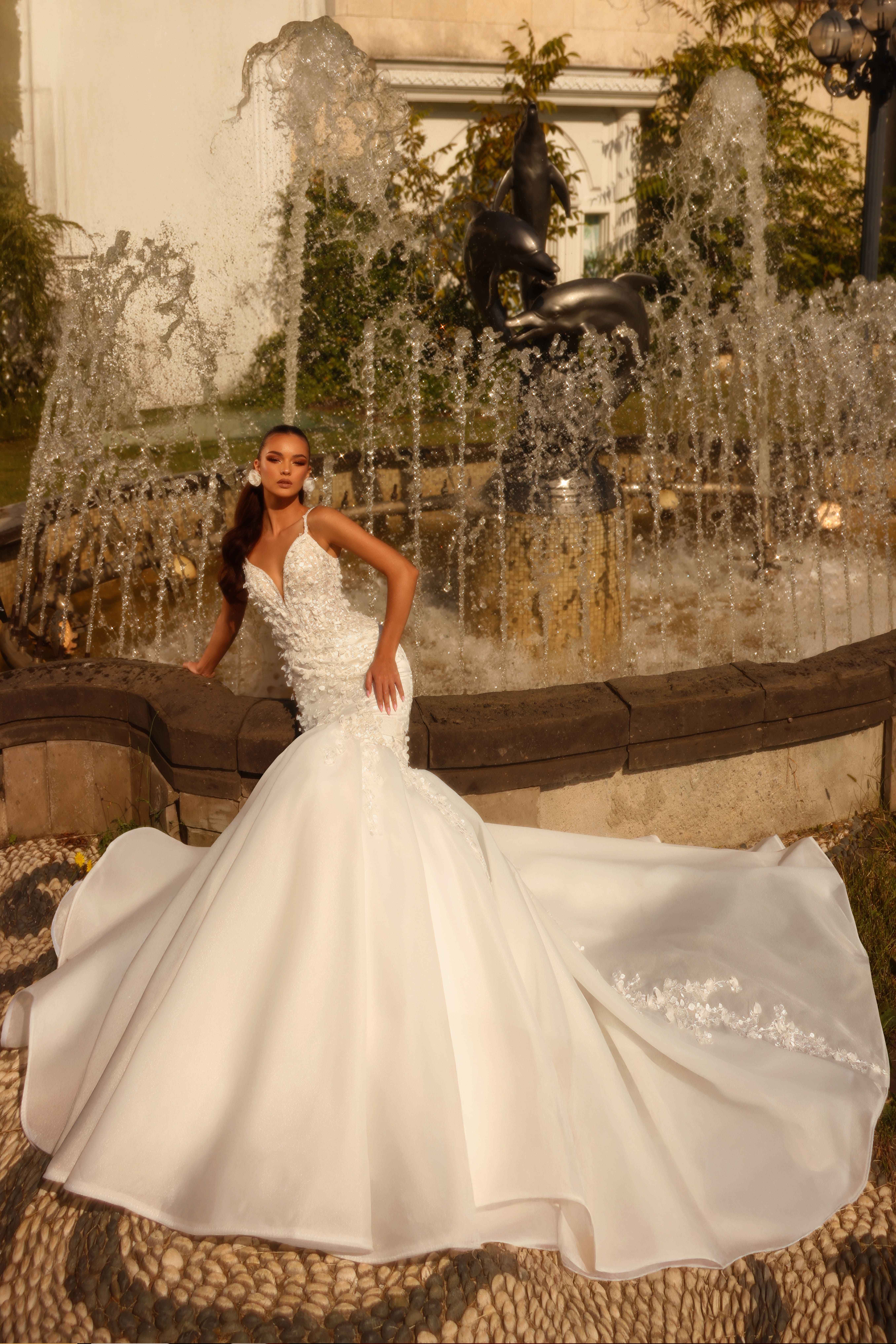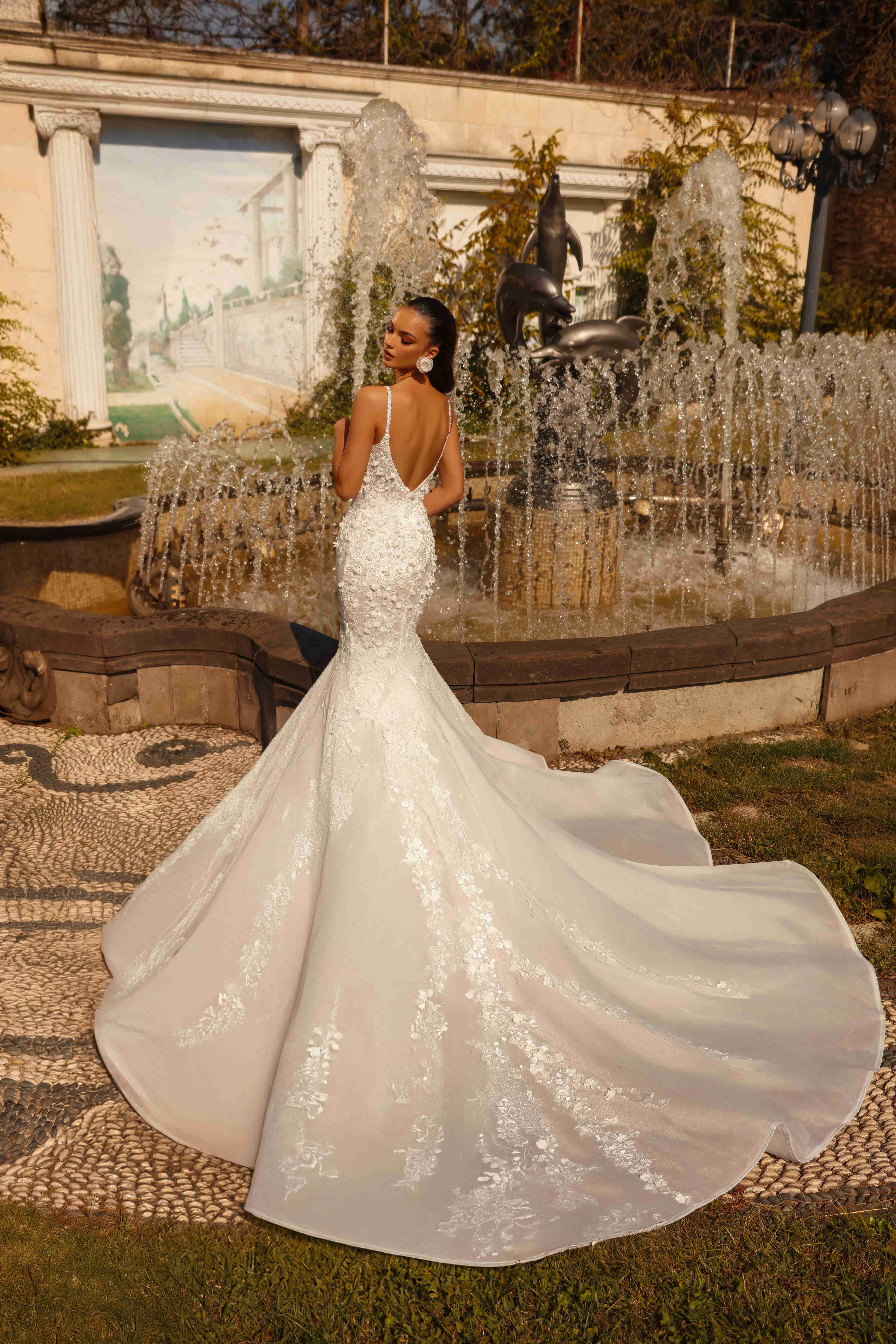 Γοργονέ νυφικό με εντυπωσιακή ουρά. Διαθέτει βαθύ δαντελένιο μπούστο. Το στενό σχέδιό του αγκαλιάζει τη σιλουέτα αναδεικνύοντας τη θηλυκότητα και την κομψότητα της νύφης.