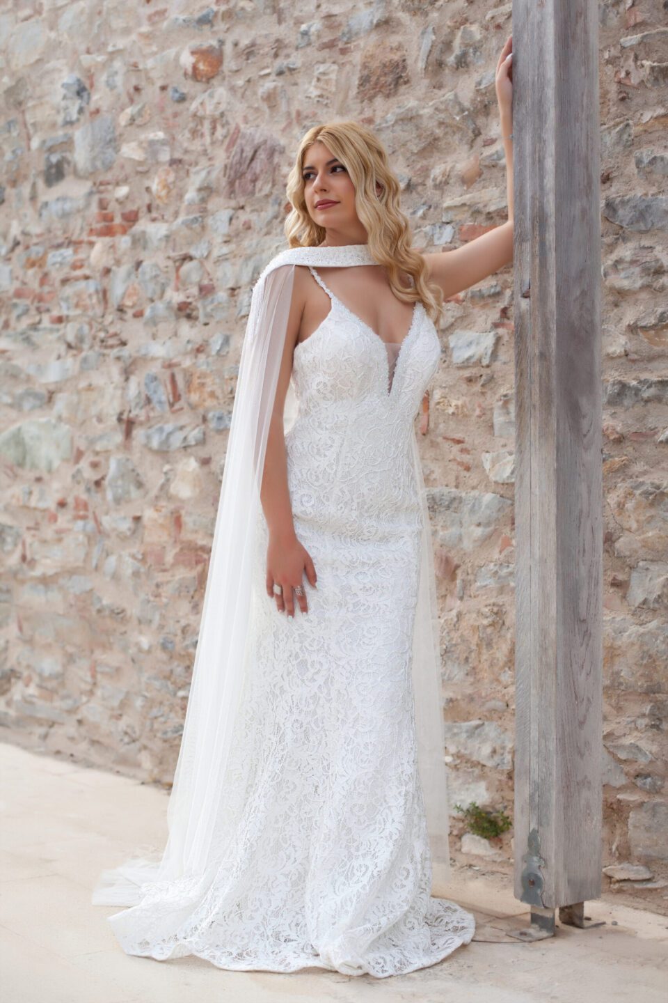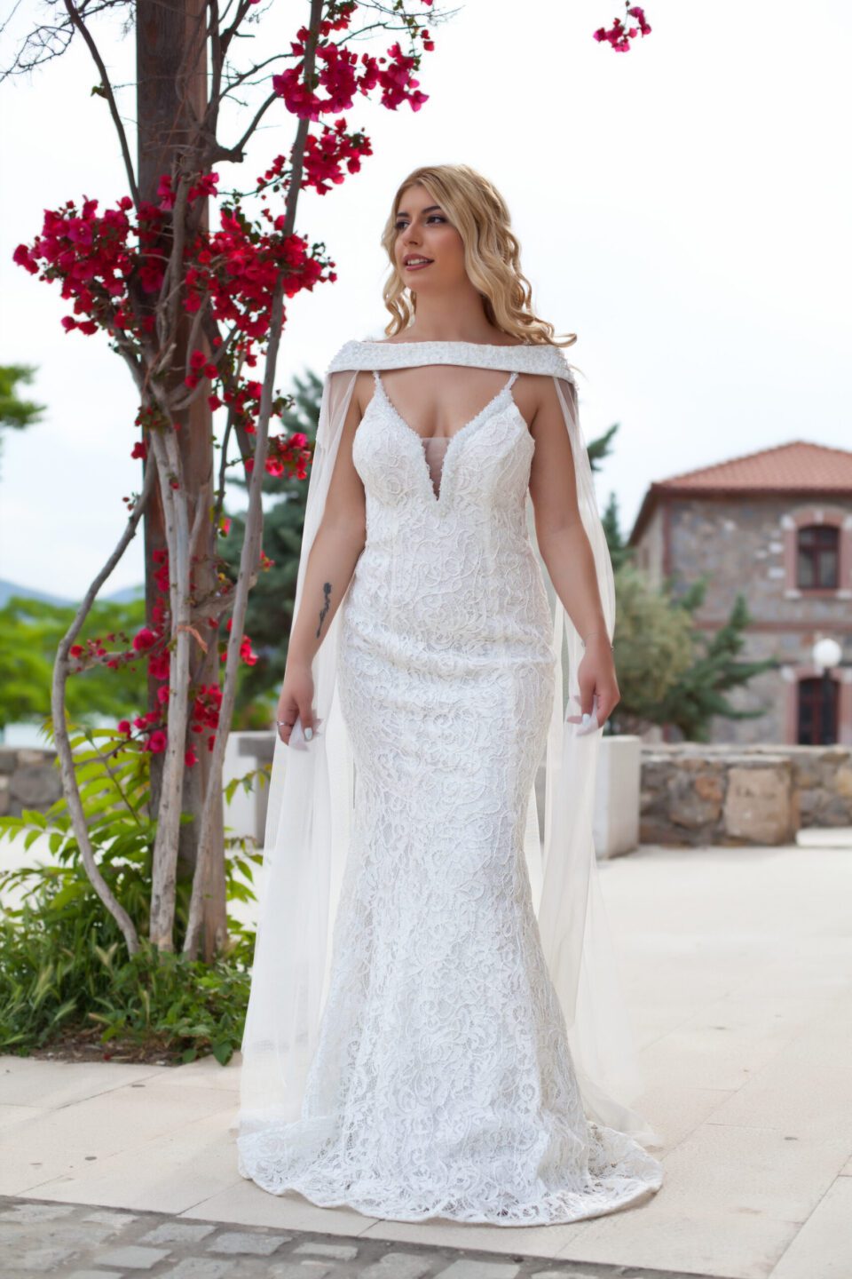 Γοργονέ νυφικό όλο δαντέλα με ουρά