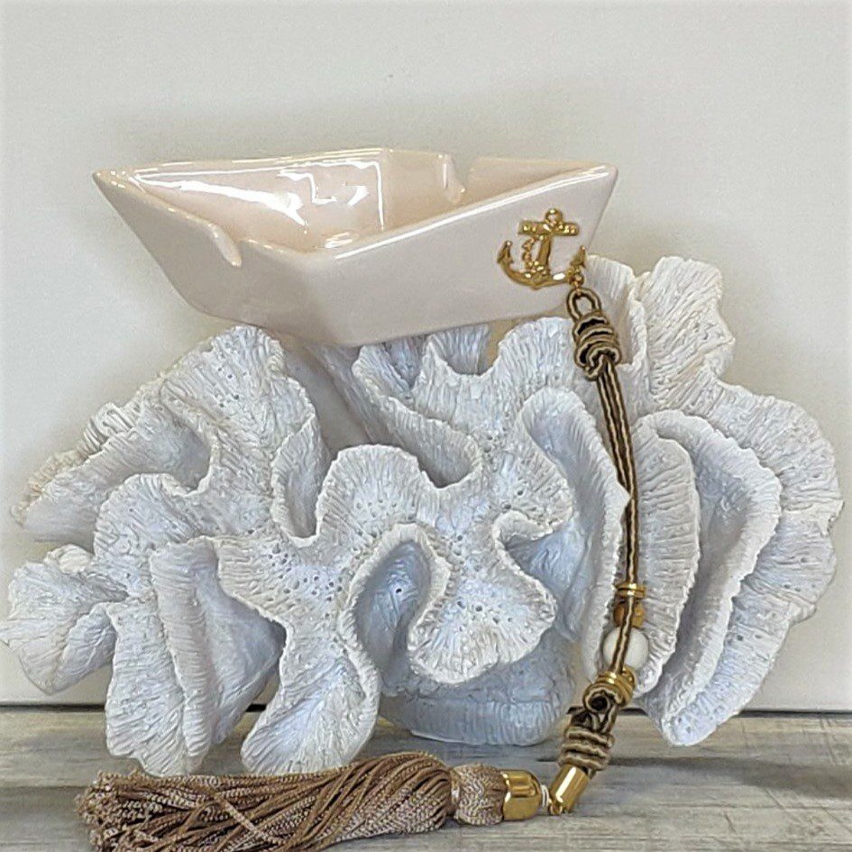 Γούρι σπιτιού 2023 εκρού καραβάκι, με κρεμαστό γούρι από κόκκινη μεταξωτή φούντα και κορδόνι με άγκυρα επιχρυσωμένη με 24 καράτια. Χειροποίητη δημιουργία κατασκευασμένο εξολοκλήρου στην Ελλάδα. Ιδιαίτερο γούρι, το πλέον κατάλληλο και μοναδικό δώρο για να το σπίτι και το γραφείο.