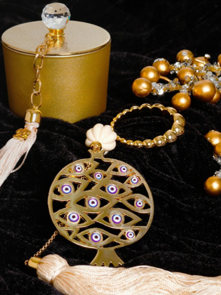Γούρι 2022 με ρόδι και ματάκια, διακοσμητικά στοιχεία επιχρυσωμένα με 24 καράτια , με σατέν κορδόνι και μεταξωτή φούντα. Μήκος 47εκ. Ένα πολυτελές γούρι, ιδανικό δώρο για το σπίτι ή το γραφείο. Ένα υπέροχο γιορτινό δώρο για τα αγαπημένα μας πρόσωπα!