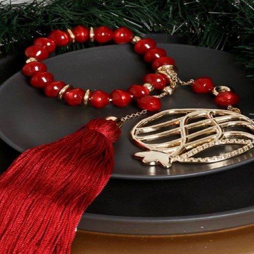 Γούρι 2023 με ρόδι και χάντρες, διακοσμητικά στοιχεία επιχρυσωμένα με 24 καράτια , με σατέν κορδόνι και μεταξωτή φούντα. Μήκος 32εκ. Ένα πολυτελές γούρι, ιδανικό δώρο για το σπίτι ή το γραφείο. Ένα υπέροχο γιορτινό δώρο για τα αγαπημένα μας πρόσωπα!