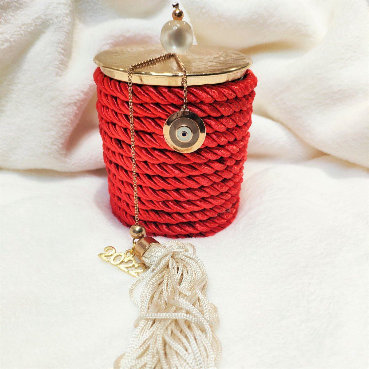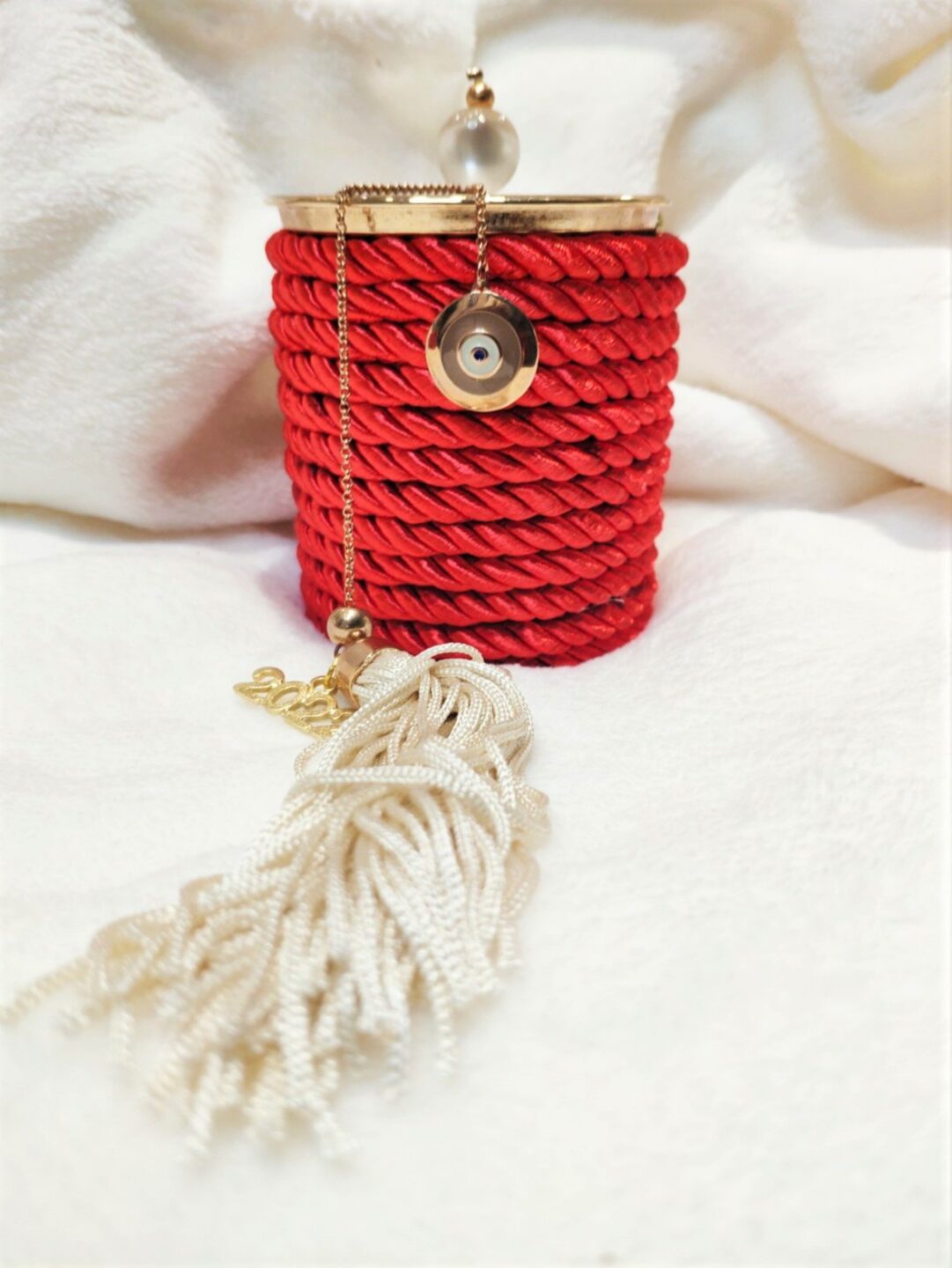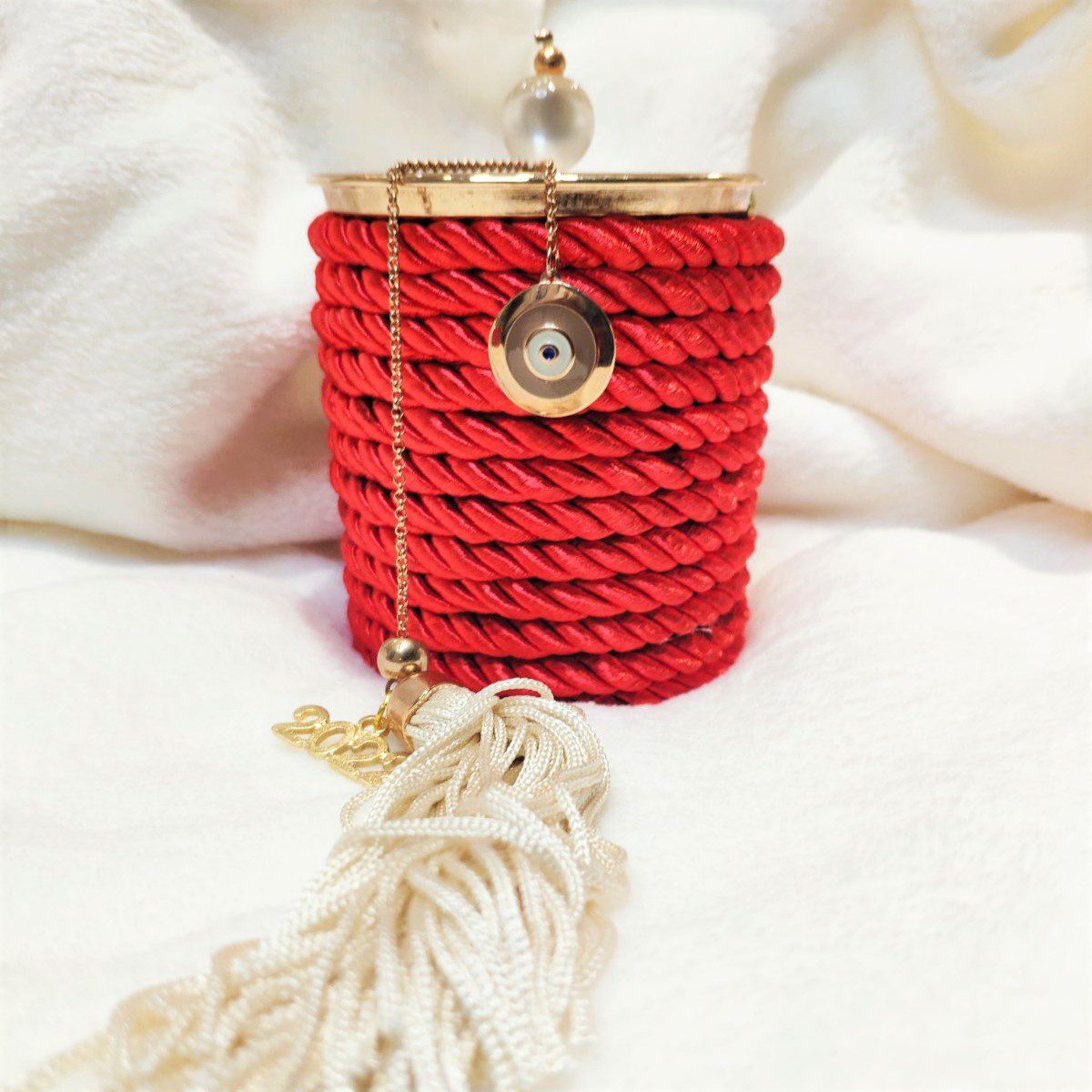 Γούρι 2023 κερί κανέλα με καπάκι και γούρι ματάκι, με σατέν κορδόνι και μεταξωτή φούντα. Ύψος 10εκ. Ένα πολυτελές γούρι, ιδανικό δώρο για το σπίτι ή το γραφείο. Ένα υπέροχο γιορτινό δώρο για τα αγαπημένα μας πρόσωπα!