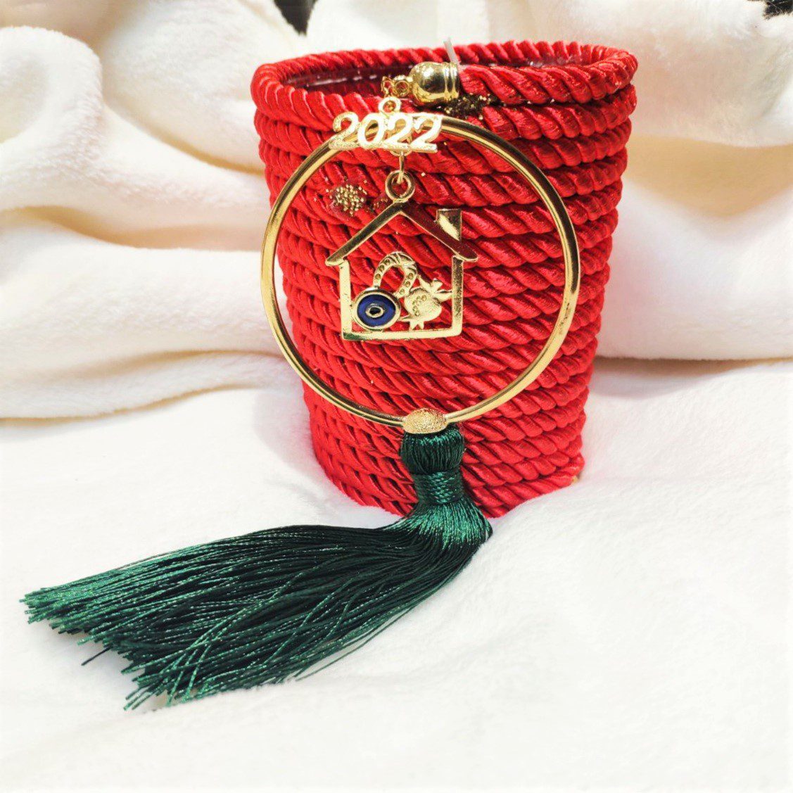 Γούρι 2023 κερί κανέλα με στεφανάκι ευχών με σπιτάκι, πέταλο, ρόδι και ματάκι, με σατέν κορδόνι και μεταξωτή φούντα. Ύψος 13εκ. Ένα πολυτελές γούρι, ιδανικό δώρο για το σπίτι ή το γραφείο. Ένα υπέροχο γιορτινό δώρο για τα αγαπημένα μας πρόσωπα!