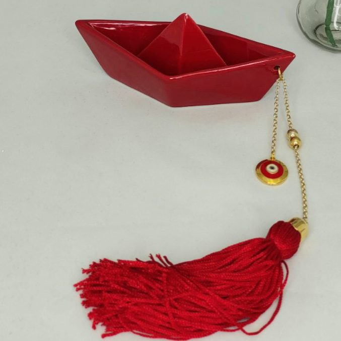 Γούρι 2023 κεραμικό καραβάκι με ματάκι, διακοσμητικά στοιχεία επιχρυσωμένα με 24 καράτια , με σατέν κορδόνι και μεταξωτή φούντα. Μήκος 17Χ10εκ. Ένα πολυτελές γούρι, ιδανικό δώρο για το σπίτι ή το γραφείο