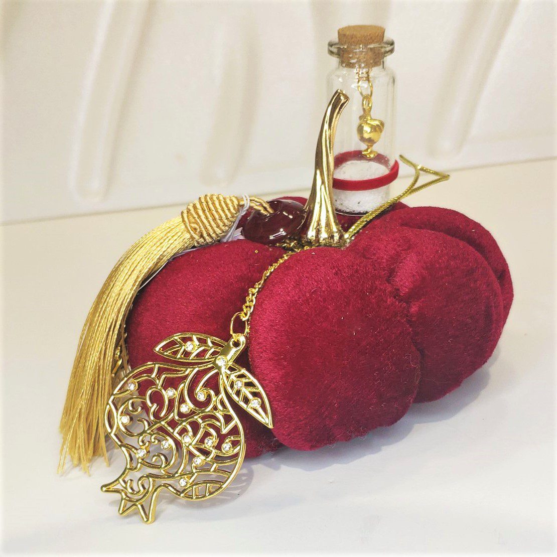 • Γούρι 2022 βελούδινη κολοκύθα με ρόδι, επιχρυσωμένο, διακοσμημένο με μεταξωτό κορδόνι και/ή φούντα. Ιδανικό δώρο για το σπίτι ή το γραφείο
