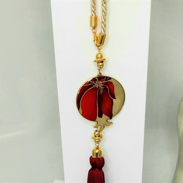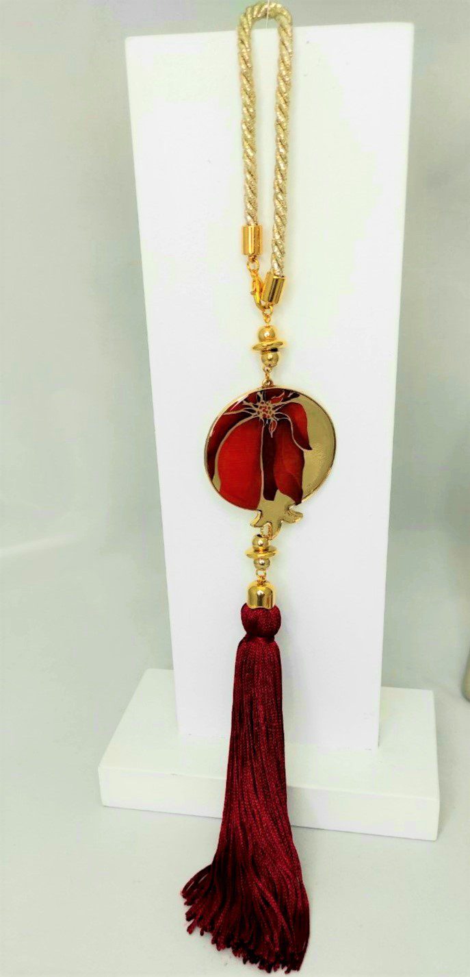 Γούρι 2022 με ρόδι από σμάλτο, διακοσμητικά στοιχεία επιχρυσωμένα με 24 καράτια , με σατέν κορδόνι και μεταξωτή φούντα. Μήκος 39 εκ. Ένα πολυτελές γούρι, ιδανικό δώρο για το σπίτι ή το γραφείο