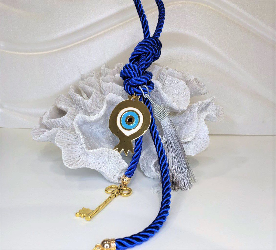 Γούρι 2023 με ρόδι, ματάκι και κλειδί, επιχρυσωμένο, διακοσμημένο με μεταξωτό κορδόνι και/ή φούντα. Μήκος 32 εκ. Ιδανικό δώρο για το σπίτι ή το γραφείο