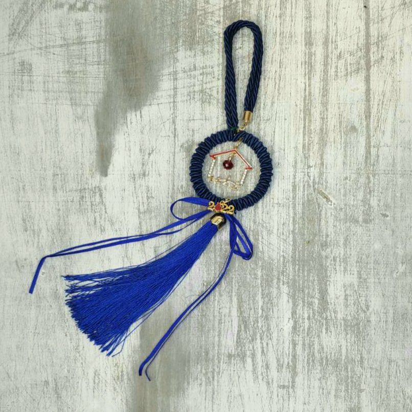 Γούρι 2022 με σπιτάκι, επιχρυσωμένο, διακοσμημένο με μεταξωτή φούντα πάνω σε plexiglass. Ιδανικό δώρο για το σπίτι ή το γραφείο