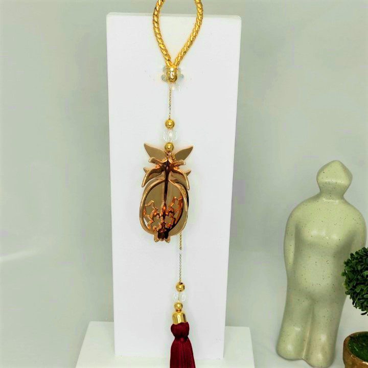 Γούρι 2022 με 3D ρόδι, διακοσμητικά στοιχεία επιχρυσωμένα με 24 καράτια , με σατέν κορδόνι και μεταξωτή φούντα. Μήκος 45εκ. Ένα πολυτελές γούρι, ιδανικό δώρο για το σπίτι ή το γραφείο