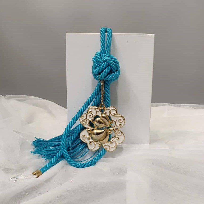 Γούρι 2023 επιχρυσωμένο με διάτρητο τετράφυλλο τριφύλλι, διακοσμητικά στοιχεία επιχρυσωμένα με 24 καράτια , με γαλάζιο σατέν κορδόνι και μεταξωτή φούντα. Ύψος 35εκ. στοιχείο 10εκ, φούντα 10εκ. Ένα πολυτελές γούρι, ιδανικό δώρο για το σπίτι ή το γραφείο