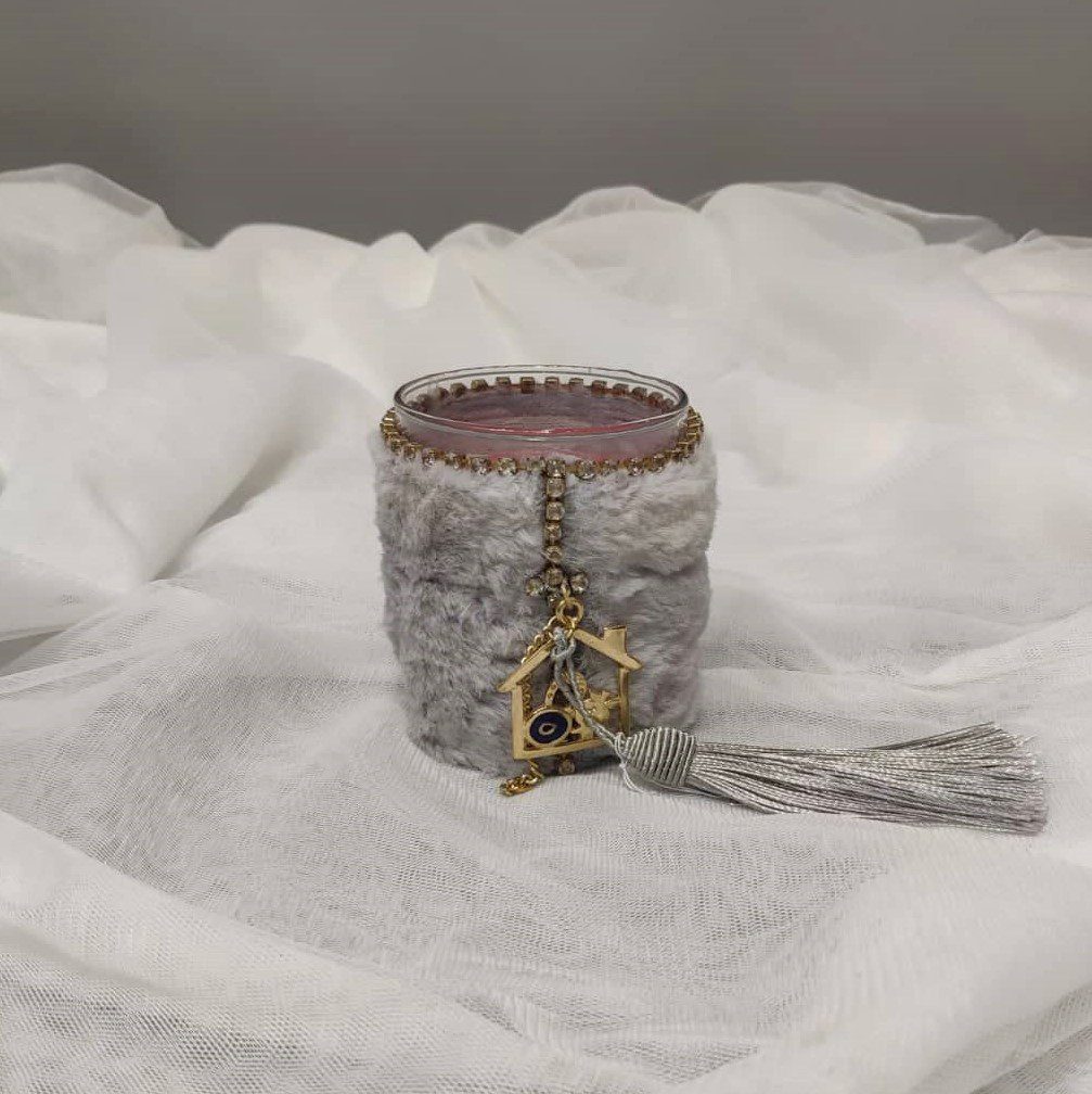 Γούρι 2023 κερί με επίχρυσο γούρι, με γκρι γουνάκι και μεταξωτή φούντα. 9×7 εκ. Ένα πολυτελές γούρι, ιδανικό δώρο για το σπίτι ή το γραφείο