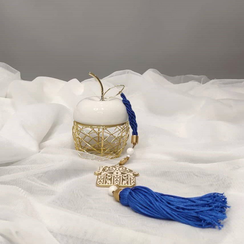 Γούρι 2023 μήλο με καπάκι και επίχρυσο γούρι με σπιτάκι, σατέν κορδόνι και μεταξωτή φούντα σε μπλε. 10×8 γούρι 33 εκ. Ένα πολυτελές γούρι, ιδανικό δώρο για το σπίτι ή το γραφείο