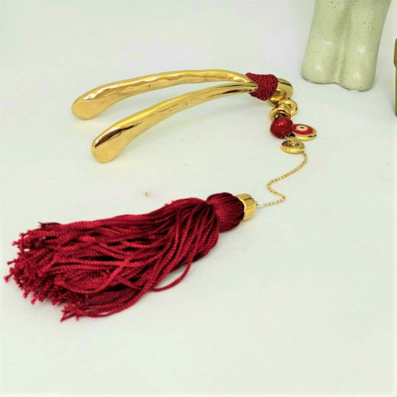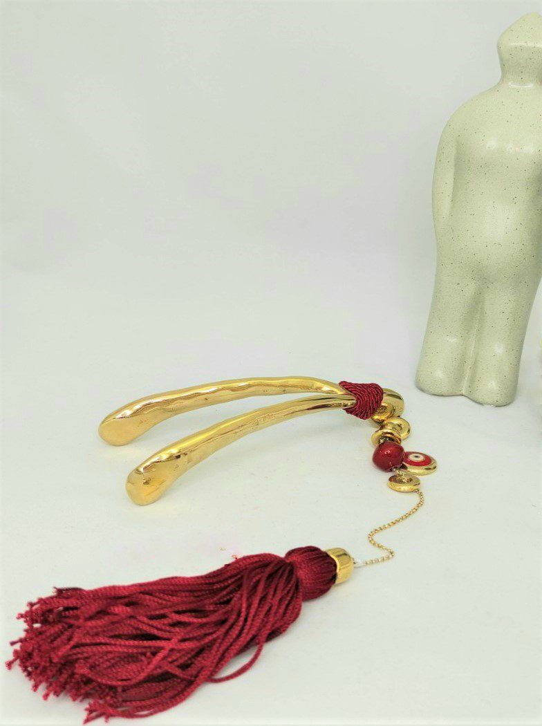 Γούρι 2023 με τυχερό κόκκαλο και ματάκι, διακοσμητικά στοιχεία επιχρυσωμένα με 24 καράτια , με σατέν κορδόνι και μεταξωτή φούντα. Μήκος 33 εκ. Ένα πολυτελές γούρι, ιδανικό δώρο για το σπίτι ή το γραφείο