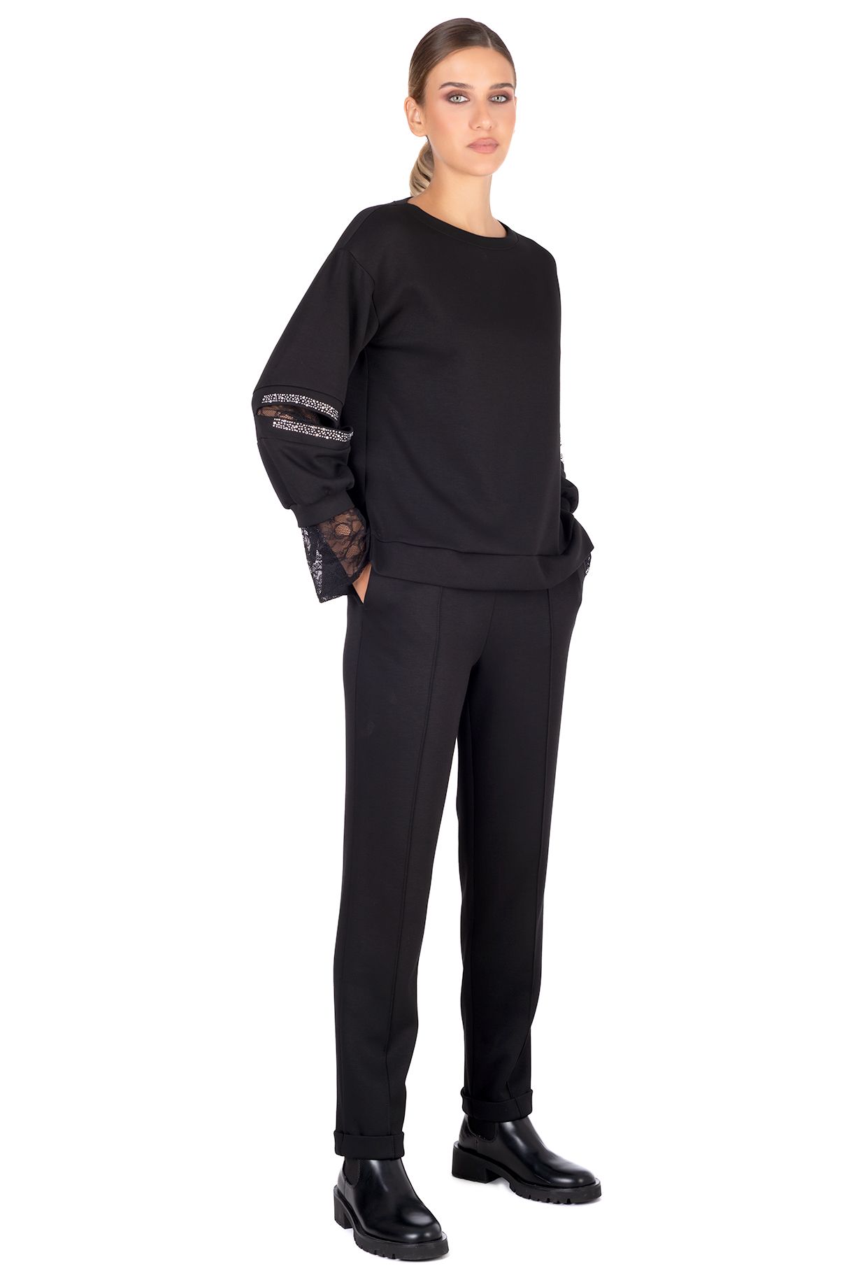 Γυναικείο pundo. παντελόνι με ρεβέρ, ελληνικής κατασκευής. Με ύφασμα pundo. Διαθέτει λάστιχο στη μέση για πιο άνετη εφαρμογή και δύο τσέπες στο πλάι.