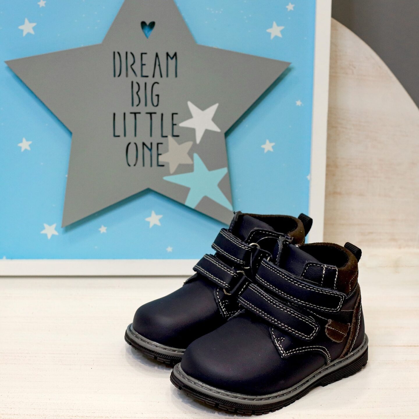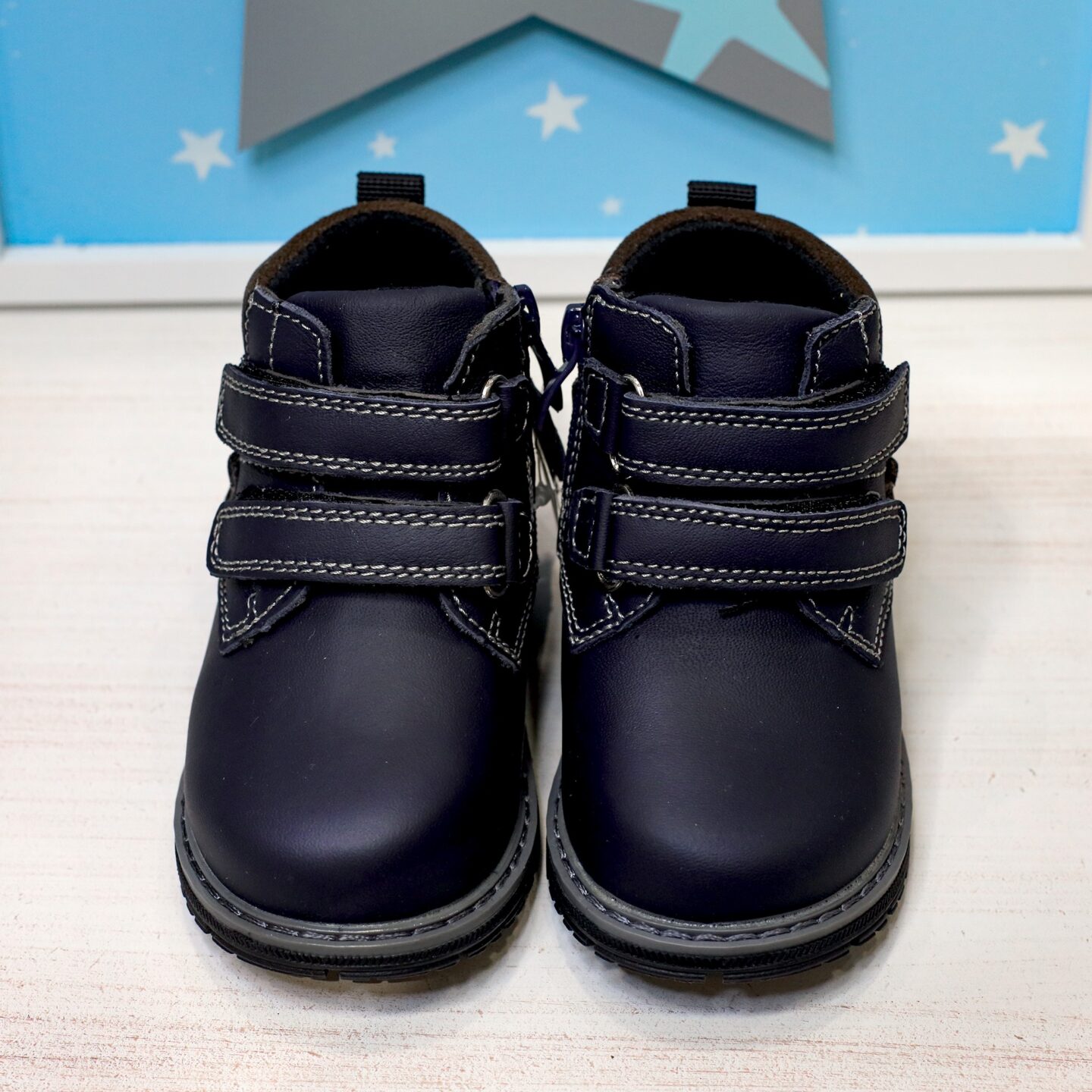 Βαπτιστικά παπούτσια δερμάτινο ανατομικό μποτάκι σε μπλε σκούρο navy blue, με αυτοκόλλητα. Ελληνικής ραφής