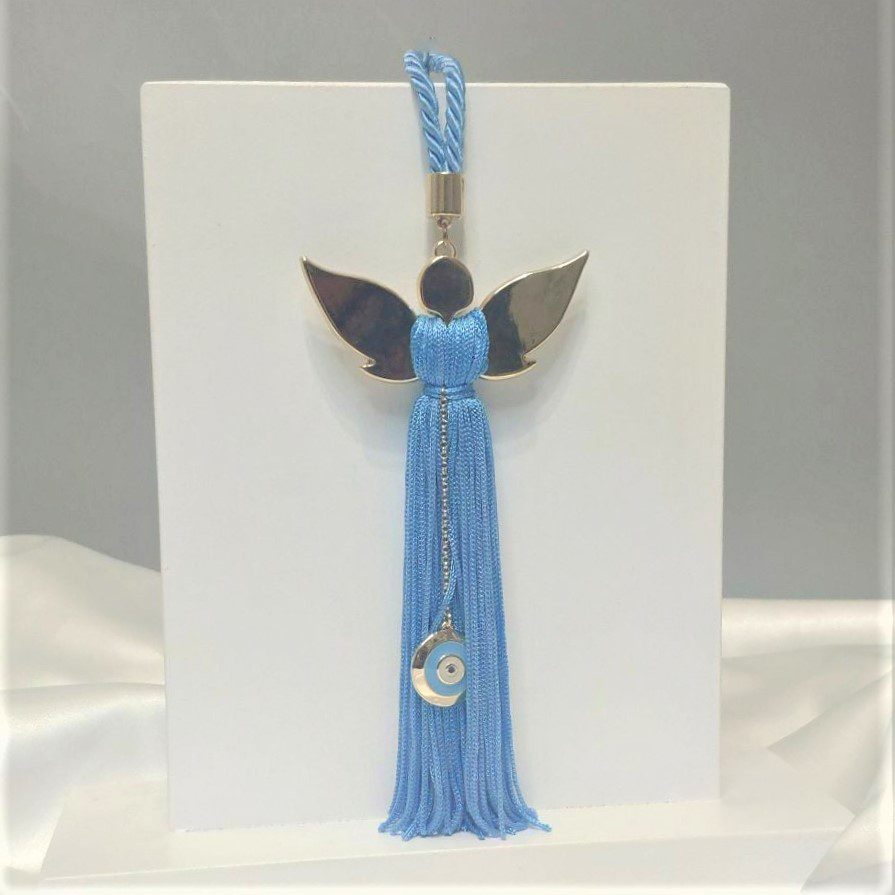 Δώρο γέννησης/βάπτισης Αγγελάκι και ματάκι επιχρυσωμένο με 24 καράτια , με μεταξωτή φούντα και σατέν κορδόνι σε γαλάζιο. Ξεχωριστό δώρο για νεογέννητα ή νεοφώτιστα παιδιά! Συνολικό μήκος 21εκ. Οι χειροποίητες δημιουργίες του Tresento είναι επιχρυσωμένες με 24 καράτια και διακοσμημένα με ημιπολύτιμους λίθους και σμάλτο. Ενδέχεται να χρειαστούν έως 15 εργάσιμες μέρες για την κατασκευή τους. Ελληνικής κατασκευής.