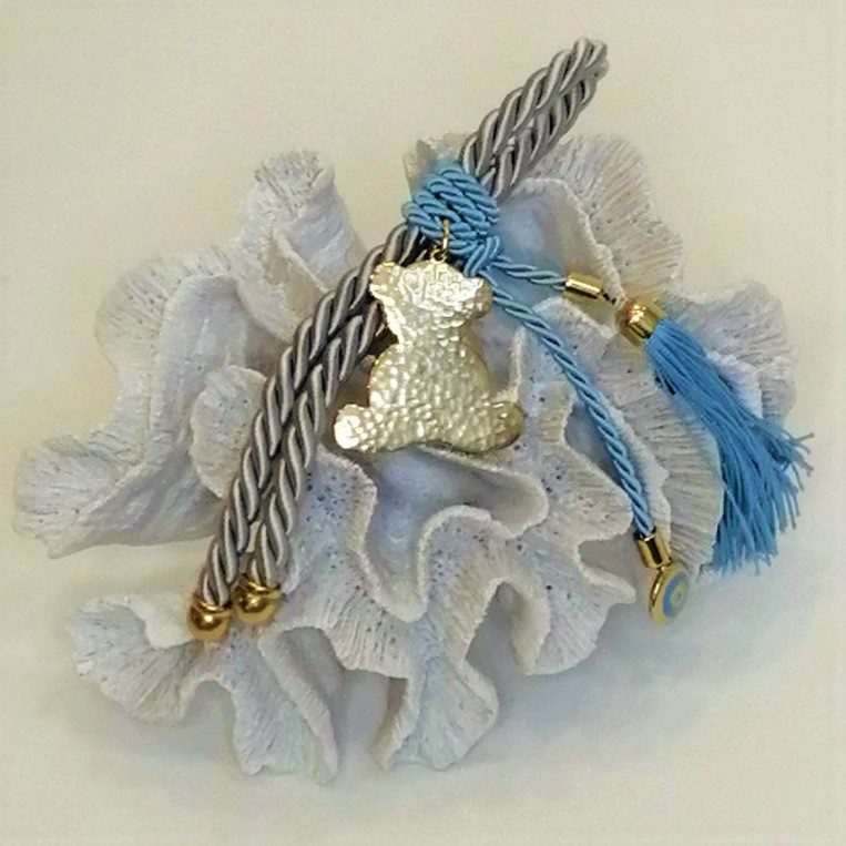 Δώρο γέννησης/βάπτισης αρκουδάκι επιχρυσωμένο με 24 καράτια , με σφυρήλατο αρκουδάκι, διακοσμημένο με ματάκι από σμάλτο, μεταξωτή φούντα σε μπλε και μεταξωτό κορδόνι σε γκρι.  Ξεχωριστό δώρο για νεογέννητα ή νεοφώτιστα παιδιά! Συνολικό μήκος 28εκ., αρκουδάκι 5εκ. Οι χειροποίητες  δημιουργίες του Tresento είναι επιχρυσωμένες με 24 καράτια και διακοσμημένα με ημιπολύτιμους λίθους και σμάλτο. Ενδέχεται να χρειαστούν έως 15 εργάσιμες μέρες για την κατασκευή τους. Ελληνικής κατασκευής.