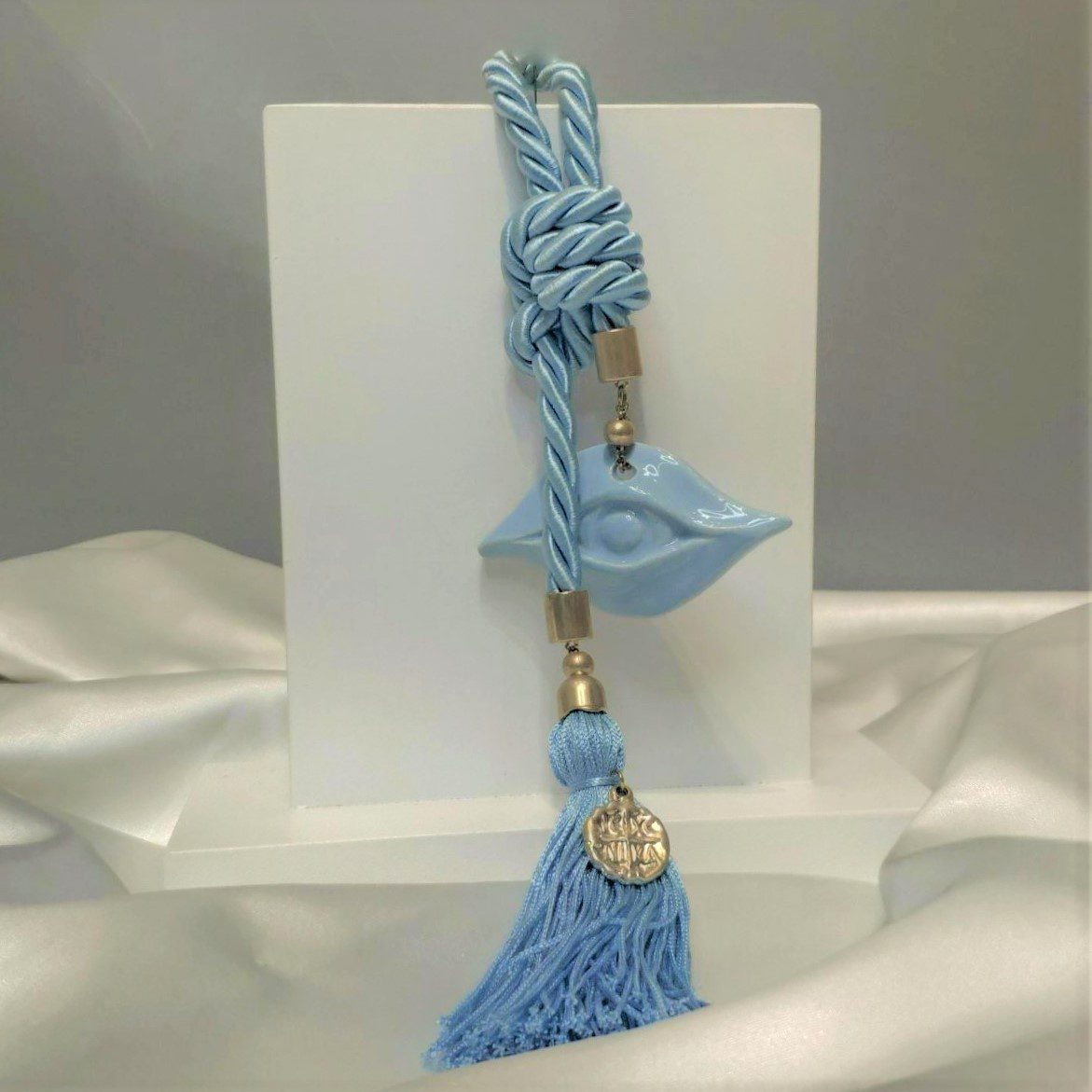 Δώρο γέννησης/βάπτισης Πεταλούδα με μεγάλο κεραμικό μάτι, επίχρυσα στοιχεία με μεταξωτή φούντα και σατέν κορδόνι σε γαλάζιο. Ξεχωριστό δώρο για νεογέννητα ή νεοφώτιστα παιδιά! Συνολικό μήκος 30 εκ. Οι χειροποίητες δημιουργίες του Tresento είναι επιχρυσωμένες με 24 καράτια και διακοσμημένα με ημιπολύτιμους λίθους και σμάλτο. Ενδέχεται να χρειαστούν έως 15 εργάσιμες μέρες για την κατασκευή τους. Ελληνικής κατασκευής.
