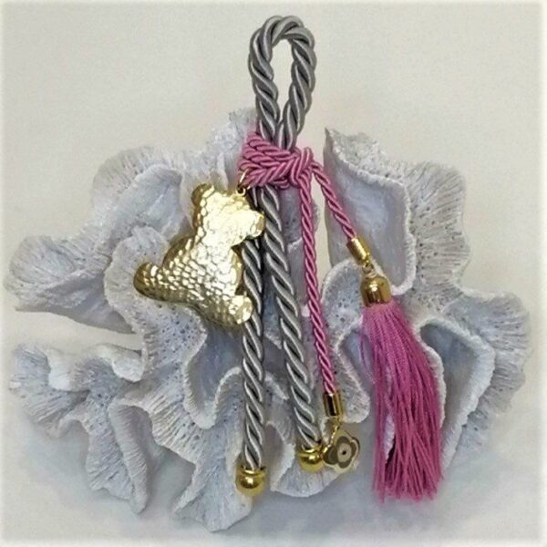Δώρο γέννησης/βάπτισης ροζ αρκουδάκι επιχρυσωμένο με 24 καράτια , με σφυρήλατο αρκουδάκι, διακοσμημένο με ματάκι από σμάλτο, μεταξωτή φούντα σε ροζ και μεταξωτό κορδόνι σε γκρι. Ξεχωριστό δώρο για νεογέννητα ή νεοφώτιστα παιδιά! Συνολικό μήκος 28εκ., αρκουδάκι 5εκ. Οι χειροποίητες δημιουργίες του Tresento είναι επιχρυσωμένες με 24 καράτια και διακοσμημένα με ημιπολύτιμους λίθους και σμάλτο. Ενδέχεται να χρειαστούν έως 15 εργάσιμες μέρες για την κατασκευή τους. Ελληνικής κατασκευής.